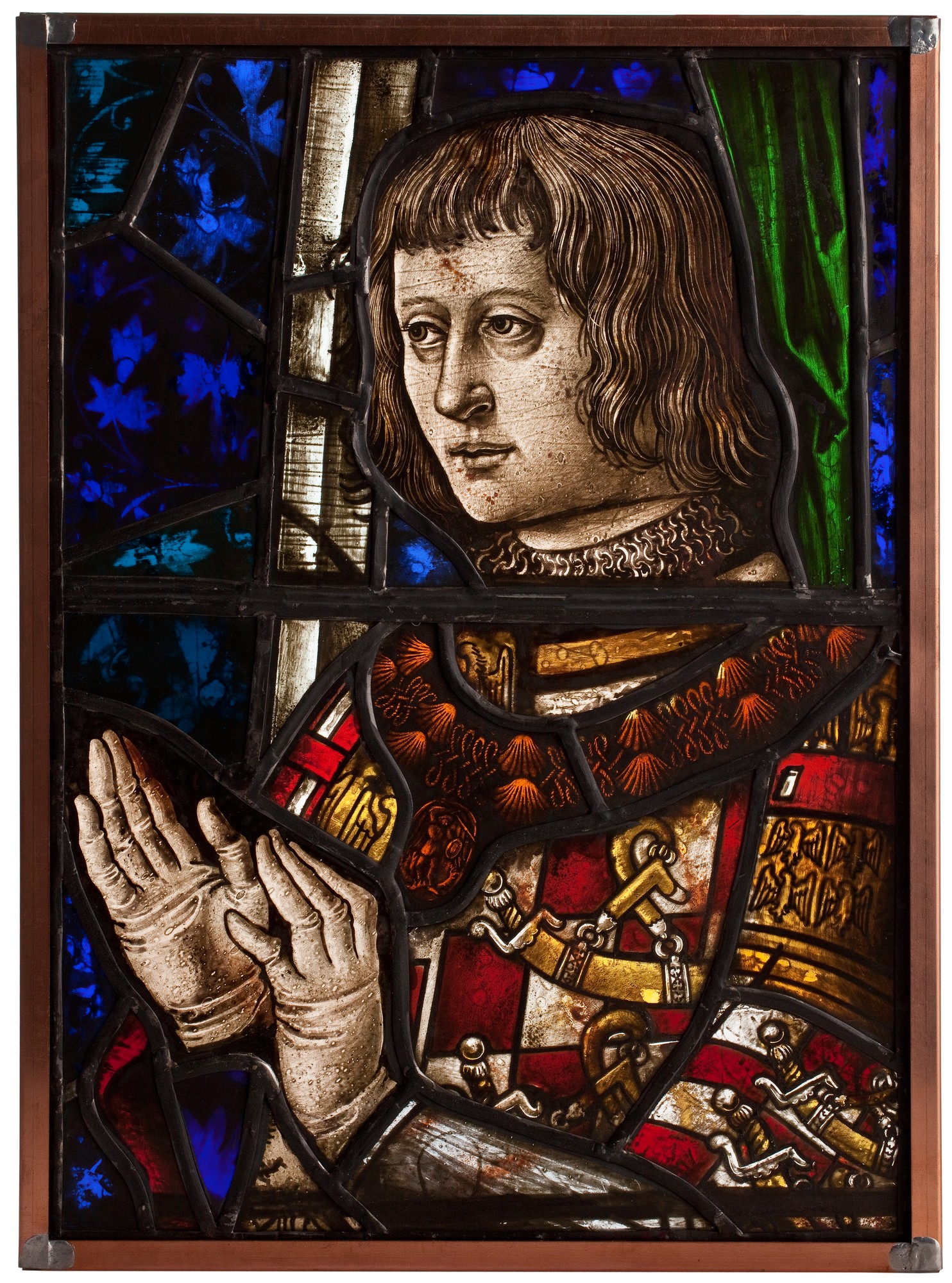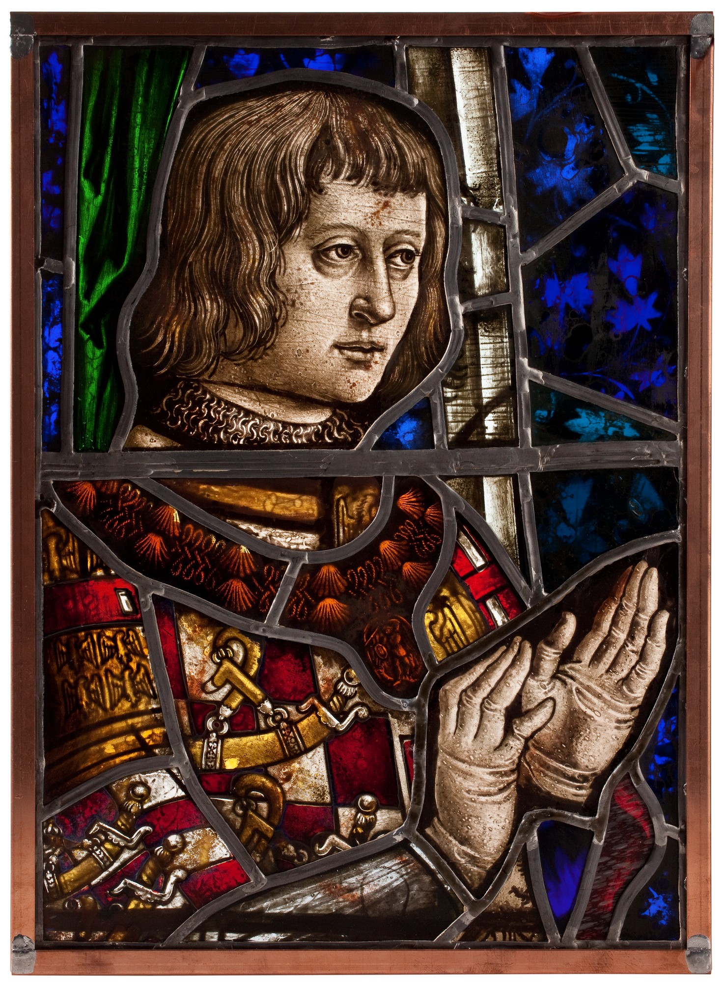 material: transparent glass, lead, outliner paint, patina, enamel paint, silver lasure