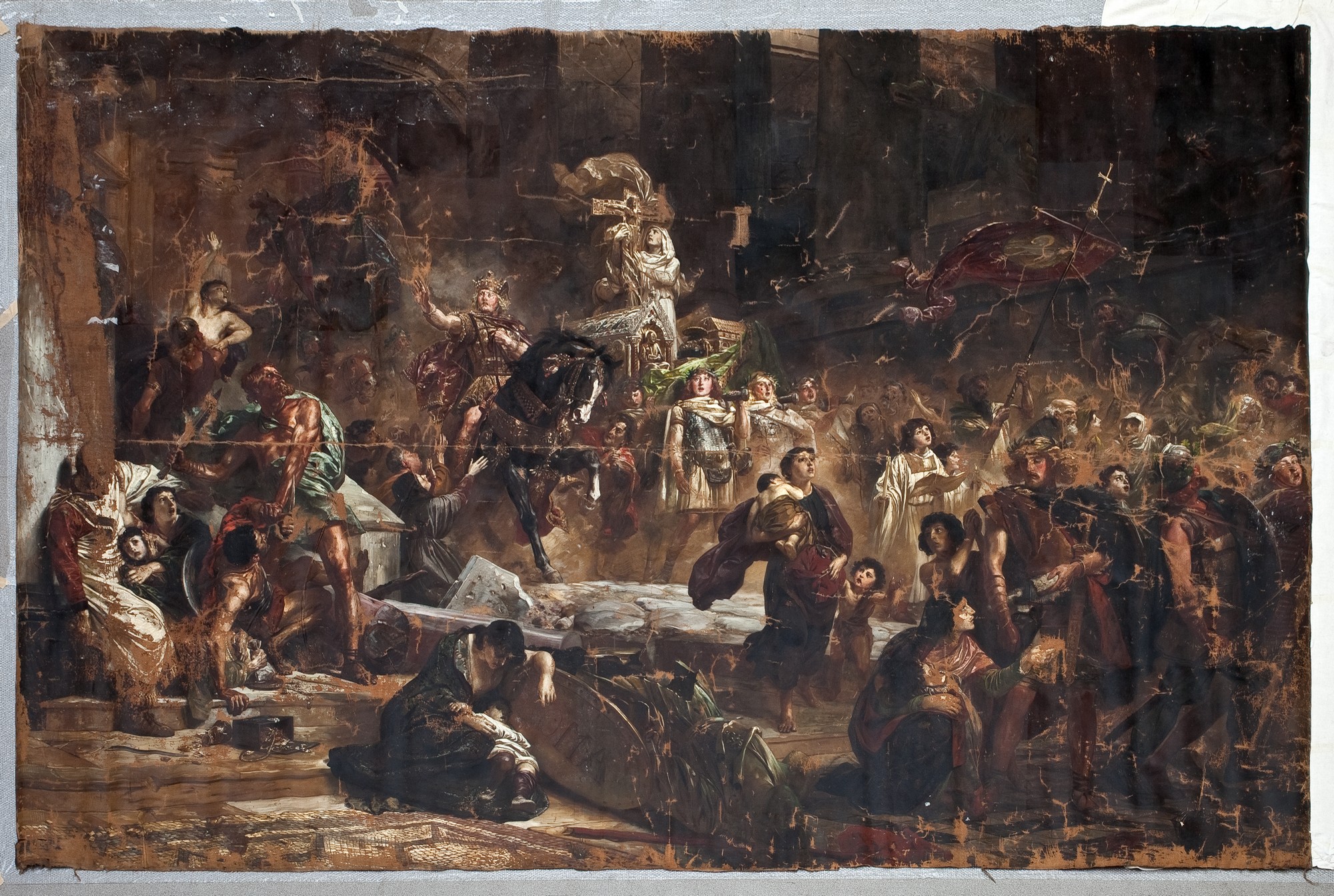 słowa kluczowe: dawne Muzeum w Zgorzelcu / Museum für Stadtgeschichte (instytucja)  |  Kaiser-Friedrich-Museum, Görlitz (1904-1945) (instytucja)  |  koń (zwierzę)  |  król  |  krzyż  |  malarstwo (sztuki plastyczne)  |  malarstwo niemieckie  |  Münchner Kindl (figura heraldyczna)  |  Oberlausitzer Gedenkhalle, Görlitz / Górnołużyca Izba Pamięci, Zgorzelec (dawna lokalizacja)  |  pomnik  |  portret konny  |  relikwiarz  |  Rzym (personifikacja)  |  Rzym (Włochy)  |  tematyka historyczna  |  tłum  |  zdobycie Rzymu przez Wizygotów (1410) (wydarzenie historyczne)  |  żołnierz