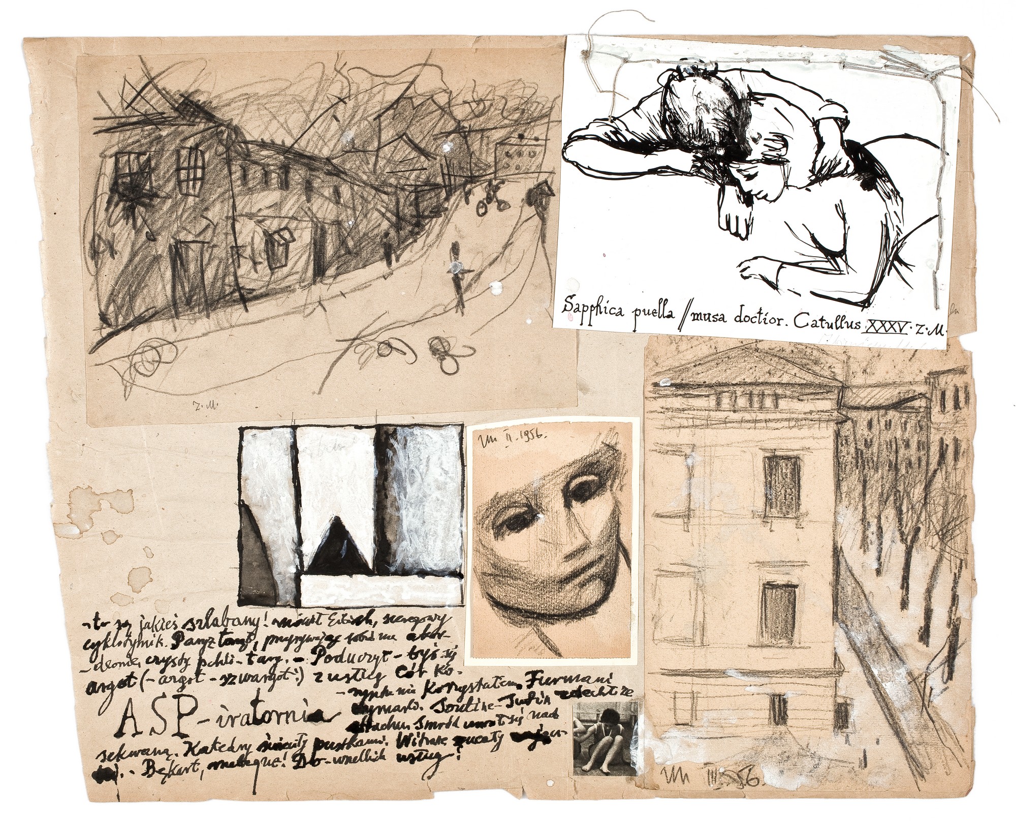 Na prostokątnym arkuszu szare papieru naklejone cztery rysunki, fotografia oraz jeden rysunek wykonany pezpośrdnio na piapierze przedstawiający czarno-białą abstrakcję geometryczną. Na górze, po lewej schematyczny rysunek przedstawiający domy stojące przy ulicy i przechodzących przez nią przechodniów; po prawej rysunek przedstawiający dwie kobiety - kobieta po lewej obejmuje lewym ramieniem kobietę obok siebie. Na środkowym rysunku fragment głowy ze schematycznym opracowaniem twarzy. Poniżej mała czarno-biała fotografia przedstawiająca podnoszącą się z przysiadu dziewczynę/kobietę. W prawym dolnym rogu rysunek przedstawiający schematycznie oprawcowaną elewację boczną trzykondygnacyjnego budynku oraz ciągnącą się po jego prawej stronie ścieżki z ułożonymi wzdłuż niej w regularnych odstępach drzewami bez liści- w tle widać zarys budynku.