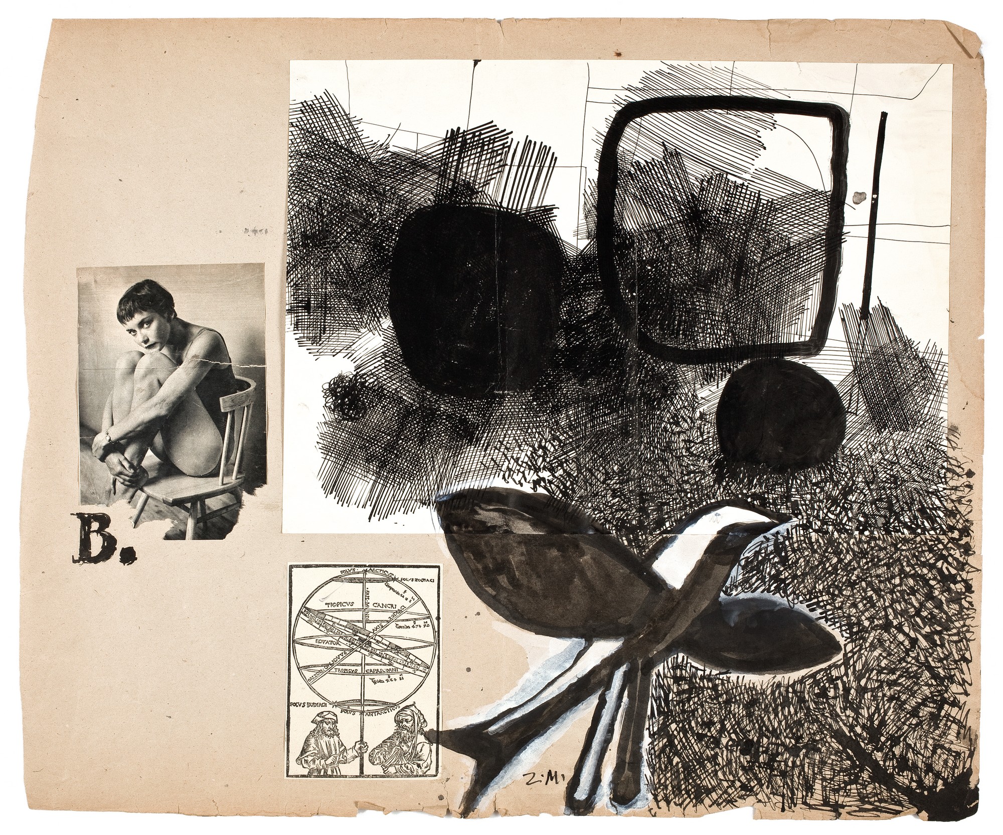 Karta z naklejonymi: fotografią, rysunkiem oraz reprodukcja drzeworytu. U dołu narysowany częściowo na karcie, częściowo na naklejonym rysunku- uproszczony wizerunek czarno-białego ptaka z rozpoztartymi skrzydłami. Po jego lewej stronie - reprodukcja późnośredniowiecznego drzeworytu z astrolabium trzymanym przez Arystotelesa i Giordana Brono (?). Po stronie prawej, pośrodku naklejona czarno-biała fotografia siedzącej z podkurczonymi nogami na krześle krótkowłosej dziewczyny w stroju kąpielowym lub gimnastycznym (Shirley Maclaine ?).
