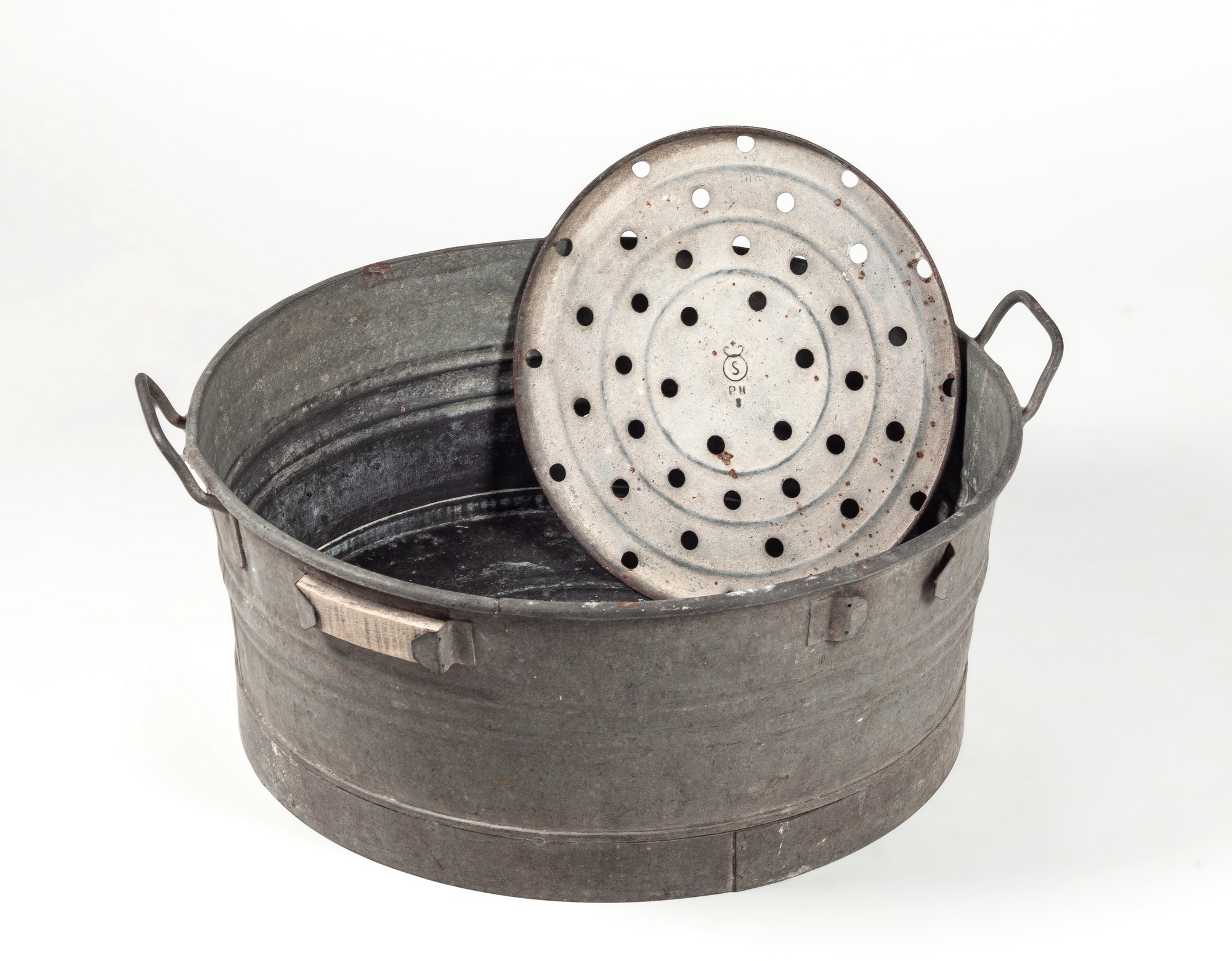 Balia z blachy ocynkowanej - formia okrągła lekko zwężająca się ku dołowi. Dno okrągłe z małym kolistym otworem wylewowym umieszczonym przy krawędzi. Górna krawędź wygięta na zewnątrz, poniżej której przeciwlegle przynitowane są dwa uchwyty z żelaznego pręta. Z jednej strony, między uchwytami przylutowane są dwie pary kątowników uprofilowanych na haczyki, o szerokości ok. 4 cm. W jednej z pary haczyków zaczepiona jest drewniana deseczka. Wewnątrz balii umieszczona okrągła, ocynkowana, perforowana blacha o mniejszej średnicy. W centralnym jej miejscu wybity znak w kształcie koła z literą S w środku, poniżej litery P i H.