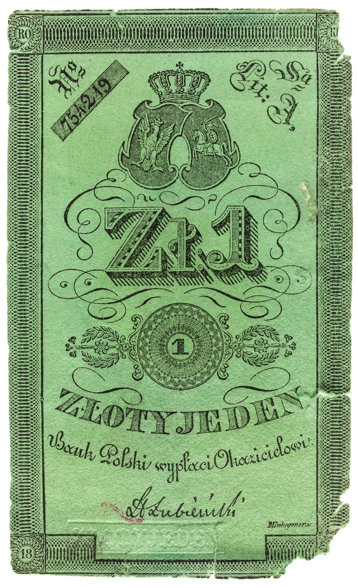 Stylizowany herb Królestwa Polskiego z okresu powstania listopadowego. Poniżej, na tle wolut, napis: ZŁ 1. Pod nim, w okrągłym obramieniu ze stylizowanym ornamentem geometrycznym, z wolutami, otwartymi wieńcami laurowymi i wypustkami ze stylizowanymi motywami roślinnymi po bokach, cyfra: 1. Niżej napis: ZŁOTY JEDEN/ Bank Polski wypłaci Okazicielowi. W dolnej części faksymile podpisu: H Łubieński. W górnej części banknotu, po bokach, napis: No (podkreślone)/ 754219 - Su (podkreślone)/ Lit: A,. Wzdłuż krawędzi banknotu obramienie wypełnione ornamentem geometrycznym. W jego rogach, w kołach stylizowanych na kwiaty napis: RO - KU/ 18 - [31].