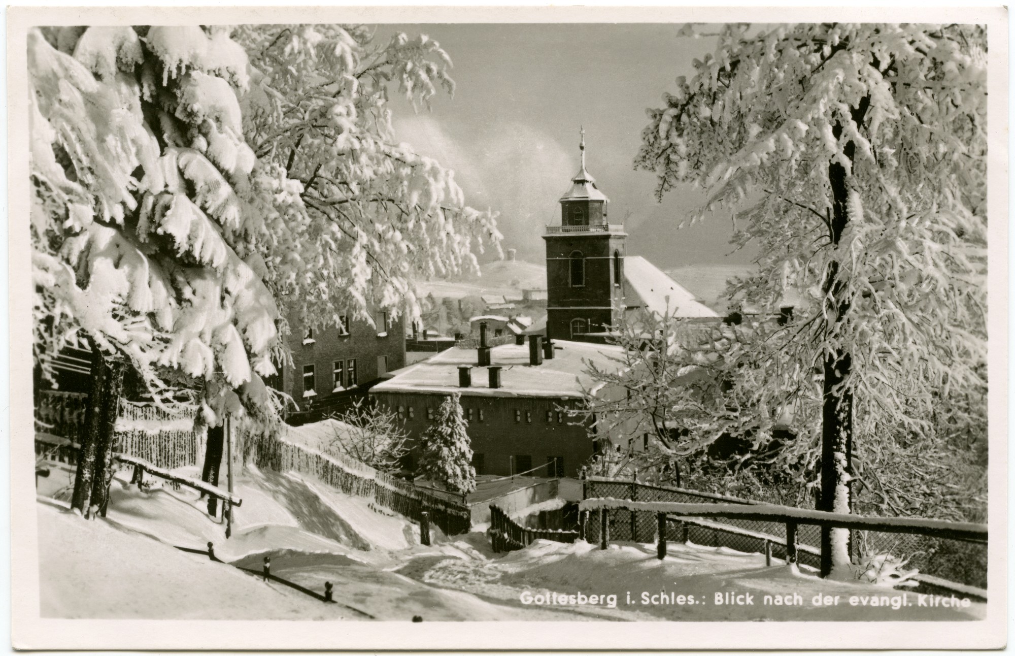 słowa kluczowe: Boguszów-Gorce (woj. dolnośląskie)  |  Gottesberg (Landkreis Waldenburg)  |  kościół (archit.)  |  Krause, Erich (fl. ca 1930-1945) – fotograf, wydawca  |  widoki Śląska  |  zima (pora roku)