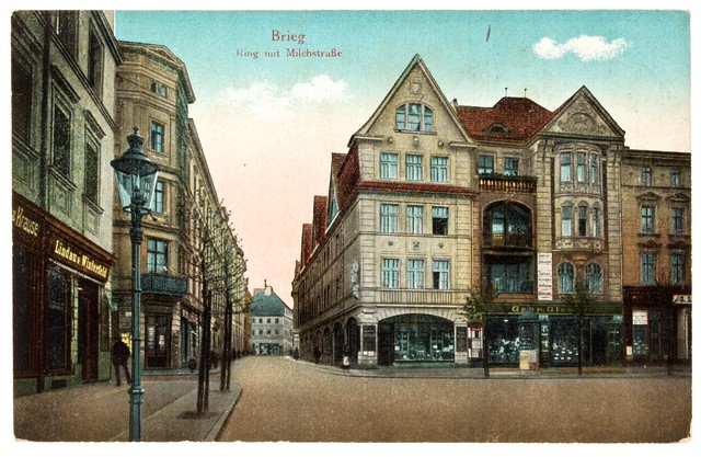 Widok obecnej ul. Mlecznej (Milchstraße) od strony Rynku w kierunku ul. Długiej (Langestraße). Na pierwszym planie widoczna narożna kamienica południowej pierzei Rynku.