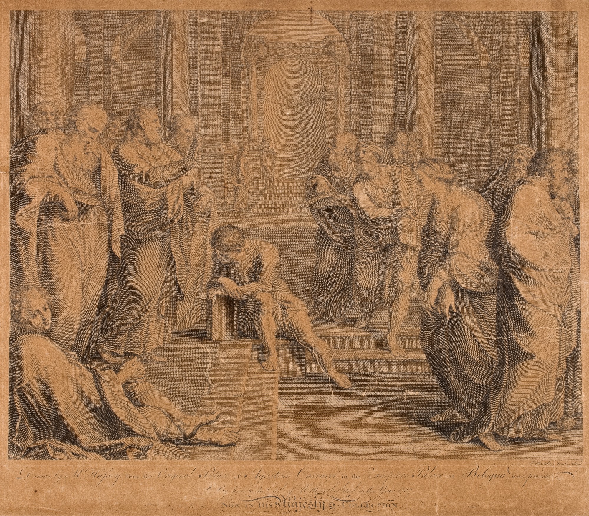u dołu pośrodku: Drawn by M.r Hussey from the Original Picture of Agostino Carracci, in the Zampieri Palace at Bologna, and presented / By him to the Earl of Northumberland in the Year 1737./ NOW IN HIS MAJESTY’S COLLECTION.