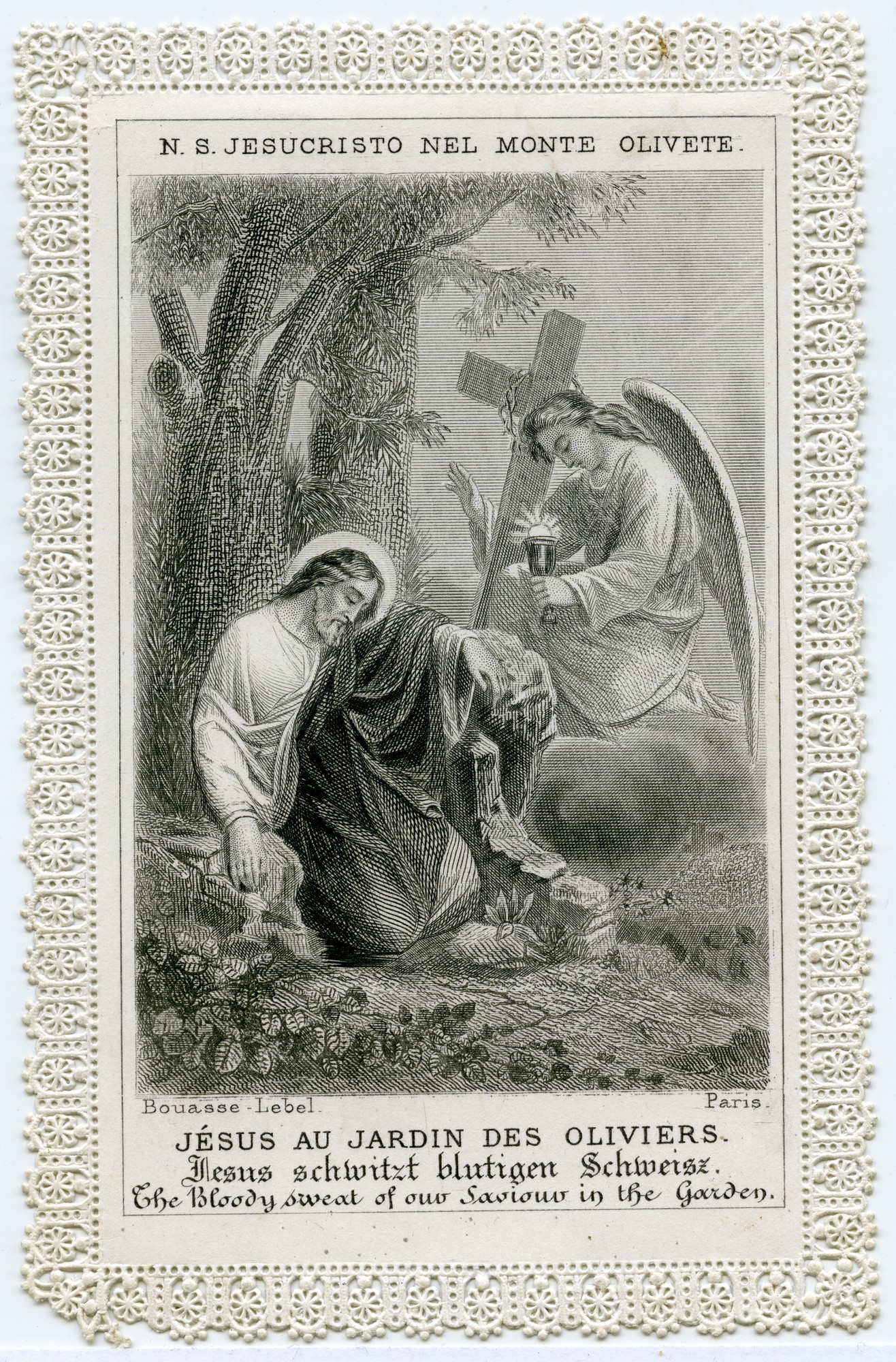 U dołu napisy: JÉSUS AU JARDIN DES OLIVIERS./ Jesus schwitzt blutigen Schweisz./ The Bloody sweat of our Saviour in the Garden. Ich treść nawiązuje do modlitwy Jezusa w Ogrójcu (Getsemani), podczas której – według Ewangelii Łukasza (Łk 22,44) – Jego pot był gęsty jak krople krwi.