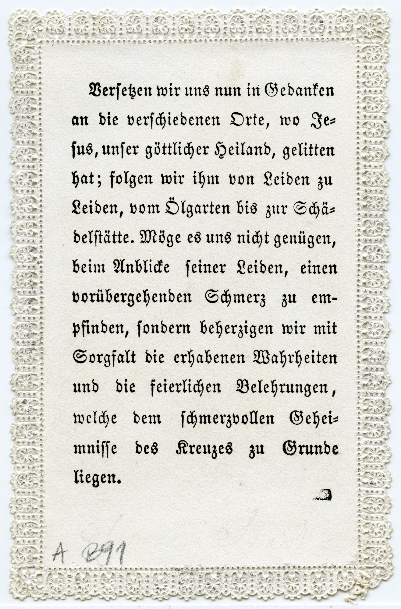 rewers: Versetzen wir uns nun in Gedanken/ an die verschiedenen Orte, wo Je-/ sus, unser göttlicher Heiland, gelitten/ hat; folgen wir ihm von Leiden zu/ Leiden, vom Ölgarte bis zur Schä-/ delstätte. Möge es uns nicht genügen,/ beim Anblicke seiner Leiden, einen/ vorübergehenden Schmerz zu em-/ pfinden, sondern beherzigen wir mit/ Sorgfalt die erhabenen Wahrheiten/ und die feierlichen Belehrungen,/ welche dem schmerzvollen Gehei-/ mnisse des Kreuzes zu Grunde/ liegen.