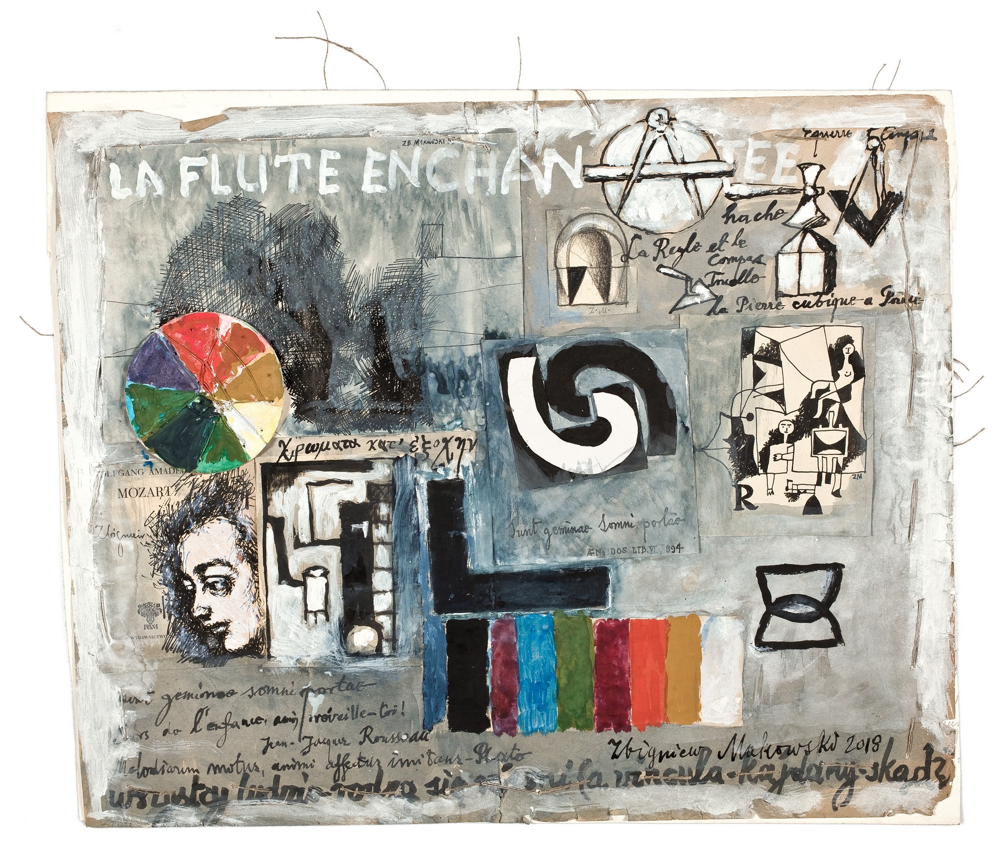Do prostokątnej karty brystolu doszyty szary papier pomalowany na szaro. Na nim przyklejonych 5 rysunków, jeden przyszyty, dwa narysowane bezposrednio na podłożu. W prawym górnym rogu - zestaw symboli wolnomularskich. Niżej 2 kompozycje figuralno-geometryczne. Pod nimi - pas kolorów oraz czarna węgielnica. Po lewej stronie, m.in. Doszyte koło barw oraz naklejony portret Mozarta oraz zarys wnętrza z piecem typu koza.