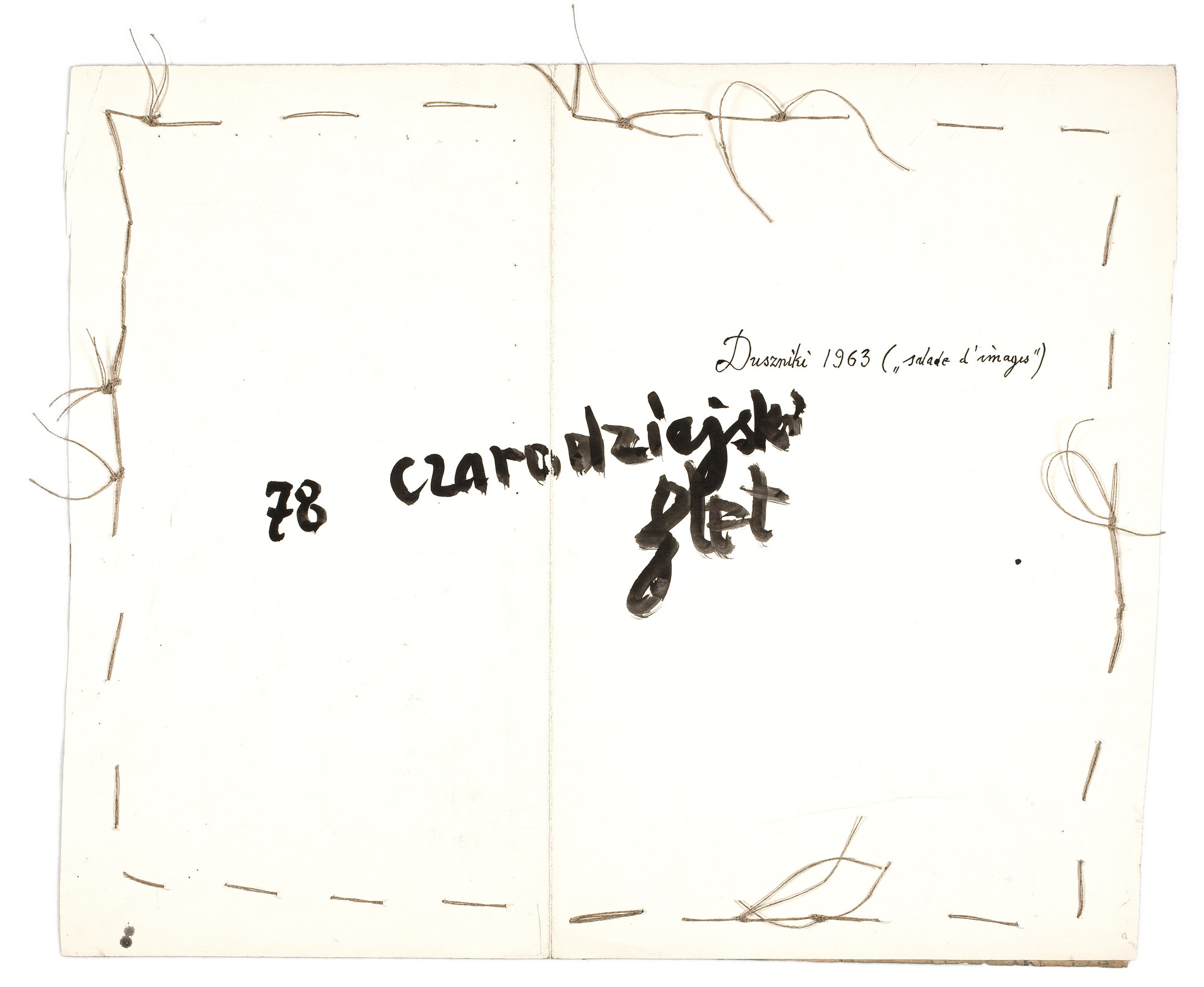 tuszem p.g.: hache / La Regle et le / Compas / Trudlo / la Pierre cubique a Por [...]; białym gwaszem, l.g.: LA FLUTE ENCHAN.....TEE; tuszem na odwrocie, pośrodku: 78 czarodziejski / flet; wyżej: Duszniki 1963 ("salade d' images")