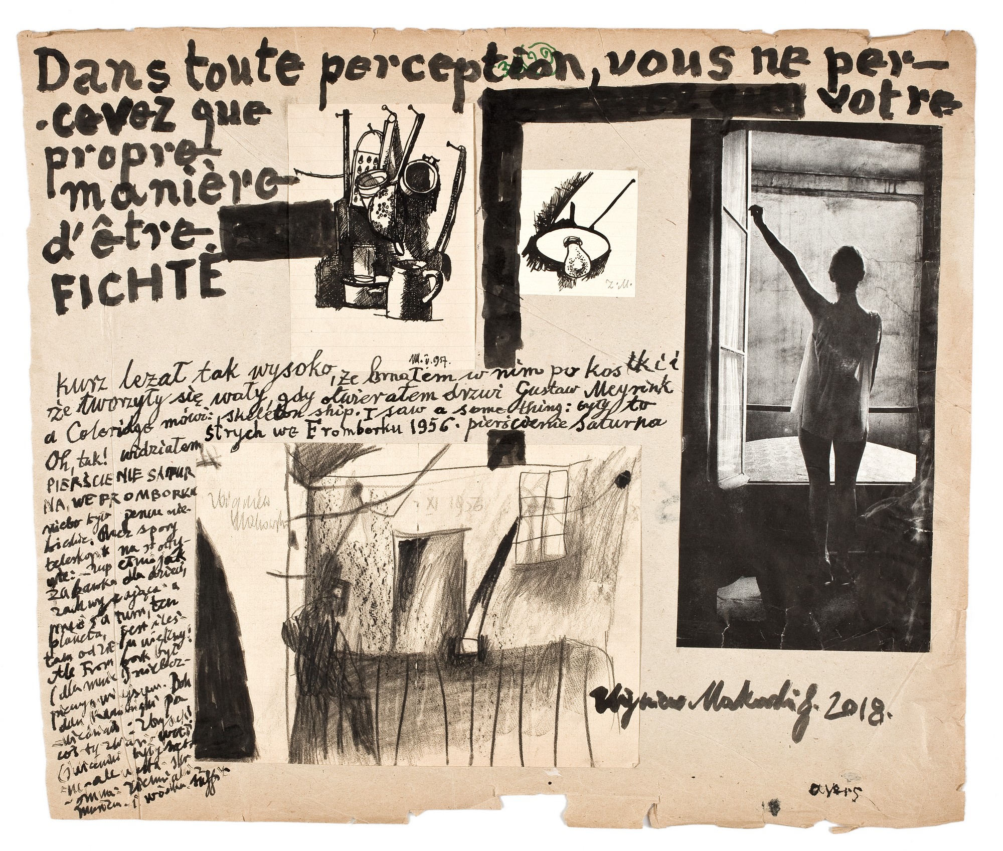 tuszem g.: Dans toute perception, vous ne per- / -covez que votre / propre- / maniere / d'etre / FICHTE / kurz leżał tak wysoko, że brnąłem w nim po kostki, / że tworzyły się wały, gdy otwierałem drzwi Gustaw Meyrink / a Caleridge mówi: skeletin ship. I saw a something: były / pierscienie Saturna / Oh, tak! widziałem PIERŚCIENIE SATUR / NA, WE FROMBORKU / niebo było jeszcze nie- / bieskie. [...]; tuszem, nad szkicem strychu: strych we Fromborku 1956.; p.d.: avers; tuszem, na odwrocie, pośrodku: 72. dans toute perception