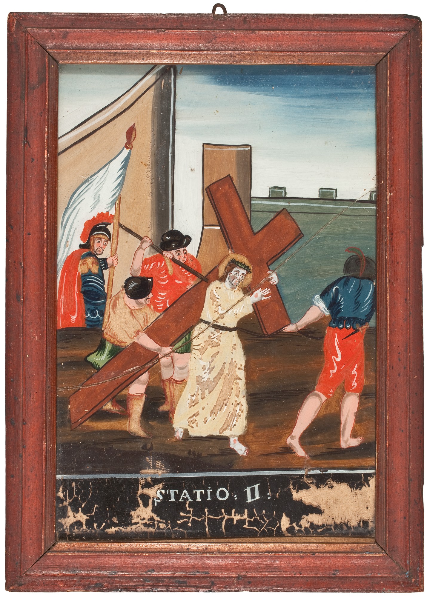Jezus w kremowej sukni niesie na ramieniu brązowy krzyż. Towarzyszą mu czterej żoł-nierze w niebieskich, czerwonych i zielonych strojach, w czarnych nakryciach głowy i w czarnych hełmach z czerwonymi pióropuszami.