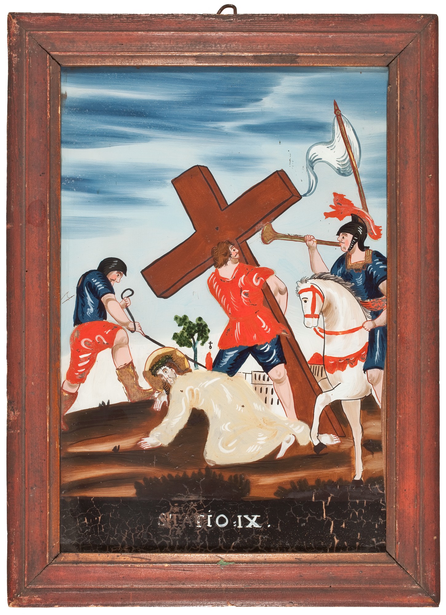 Jezus w kremowej sukni leży na brązowej ziemi. Jeden żołnierz podtrzymuje brązowy krzyż; drugi usiłuje podnieść Jezusa; trzeci, siedzący na białym koniu, w hełmie z czerwonym pióropuszem i z białym sztandarem, gra na trąbce. Stroje żołnierzy niebiesko-czerwone. Karnacje różowe, kontury czerwone, korona cierniowa Chrystusa i aureola biała.