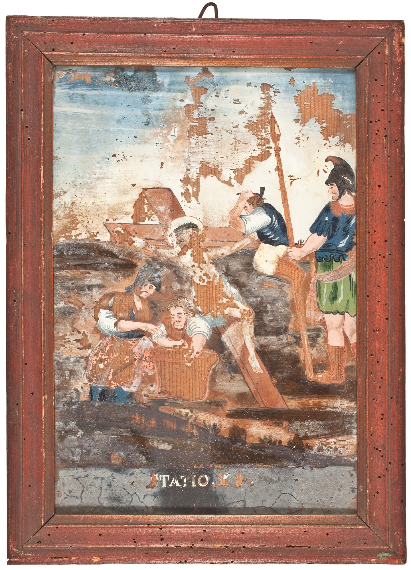 Postać Jezusa leżącego na brązowym krzyżu. Jego dłoń przybija klęczący żołnierz. Obok stoi drugi, z włócznią w ręku. Z drugiej strony widoczni dwaj pozostali. Ich ubrania niebiesko-zielono-brązowe, na nogach dwóch wysokie brązowe buty, na głowach czarne hełmy. Karnacje różowe, kontury czerwone, korona cierniowa Chrystusa zielona, aureola złota.