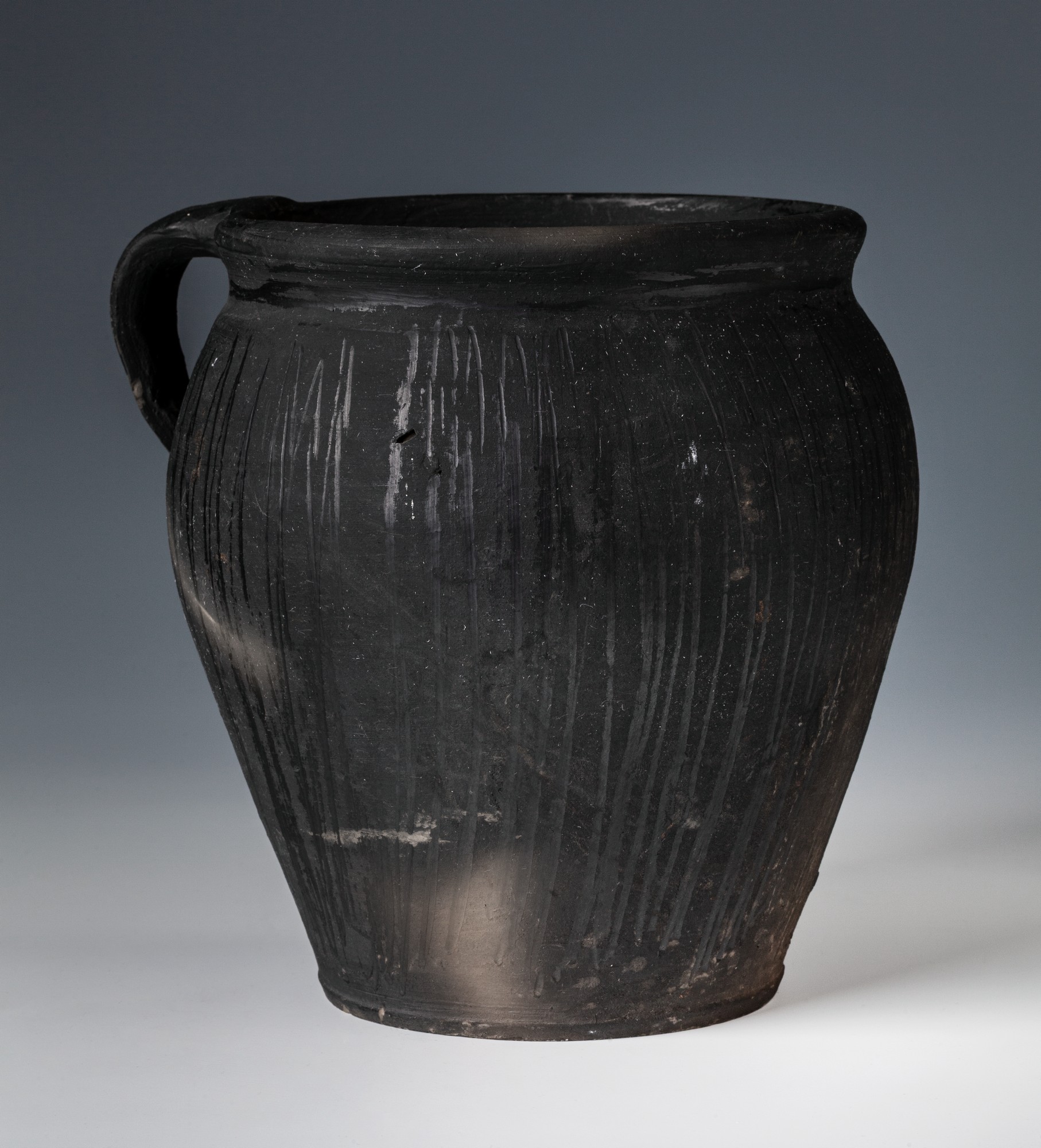Garnek gliniany typu "siwak", nieszkliwione naczynie o ciemnym zabarwieniu, uzyskanym w wyniku wypału redukcyjnego polegającego na odcięciu dopływu powietrza w końcowej fazie wypalania wyrobu. Naczynie o płaskim, wąskim dnie, owalnym brzuścu, przechodzącym w wyodrębnioną krawędź wylewu. Z jednej strony ucho o przekroju półkolistym. Powierzchnia naczynia wygładzona, z dekoracją w formie subtelnych, pionowych linii-efekt ręcznego gładzenia mokrej gliny przed wypałem.