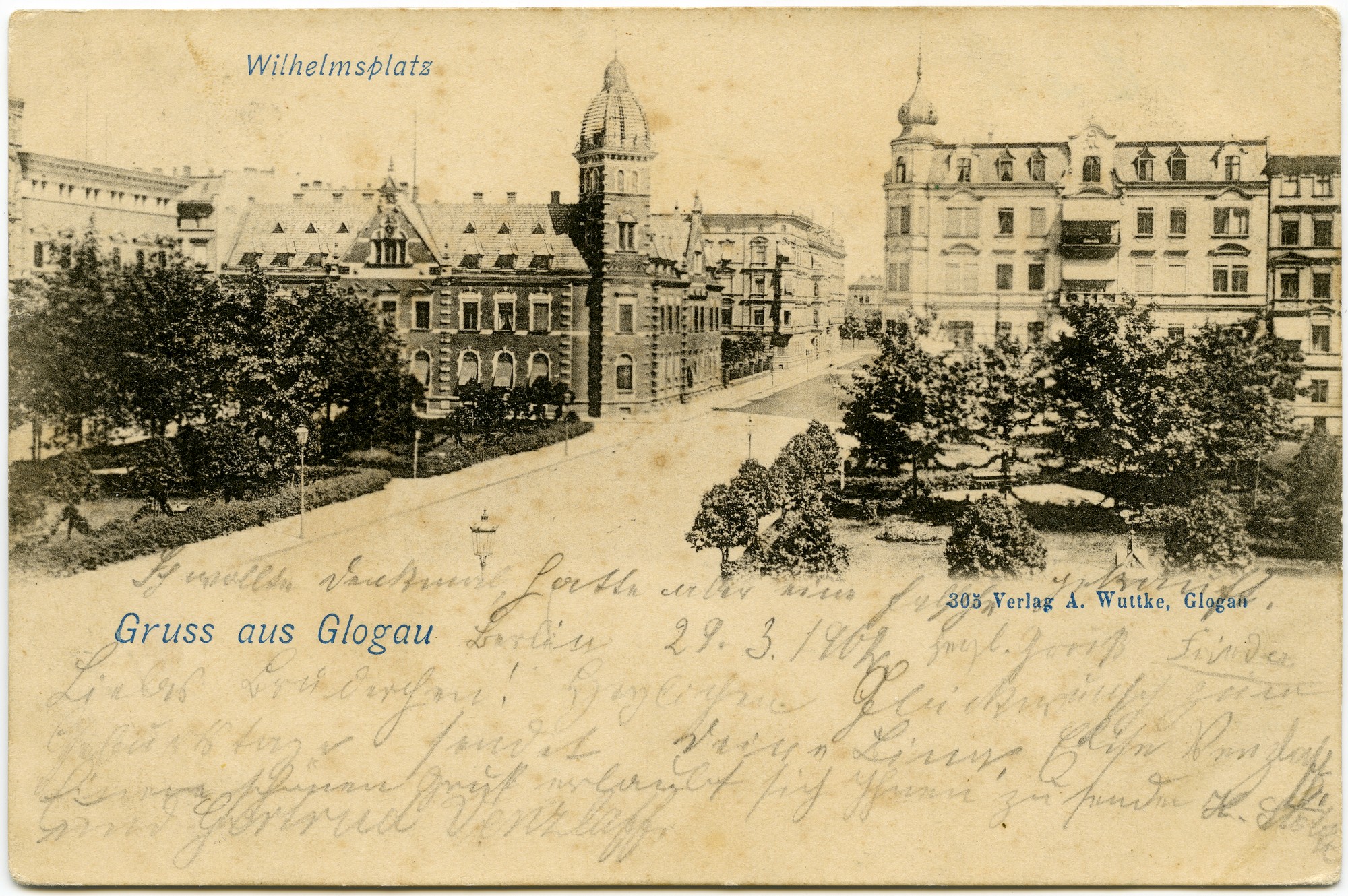 Widok obecnego pl. J. Umińskiego (Wilhelmsplatz) w kierunku dzisiejszej ul. Piaskowej (Wilhelmstrasse). Wnętrze pl. Wilhelma wypełnia specjalnie zaprojektowana zieleń. Gmach po lewej stronie ulicy, którego naroże akcentuje czworoboczna wieża zwieńczona kopułą, to poczta główna wzniesiona w 1892 roku. Z zabudowy całego placu przetrwał jedynie gmach poczty, dziś przy skrzyżowaniu ulic: Piaskowej i Piotra Skargi.