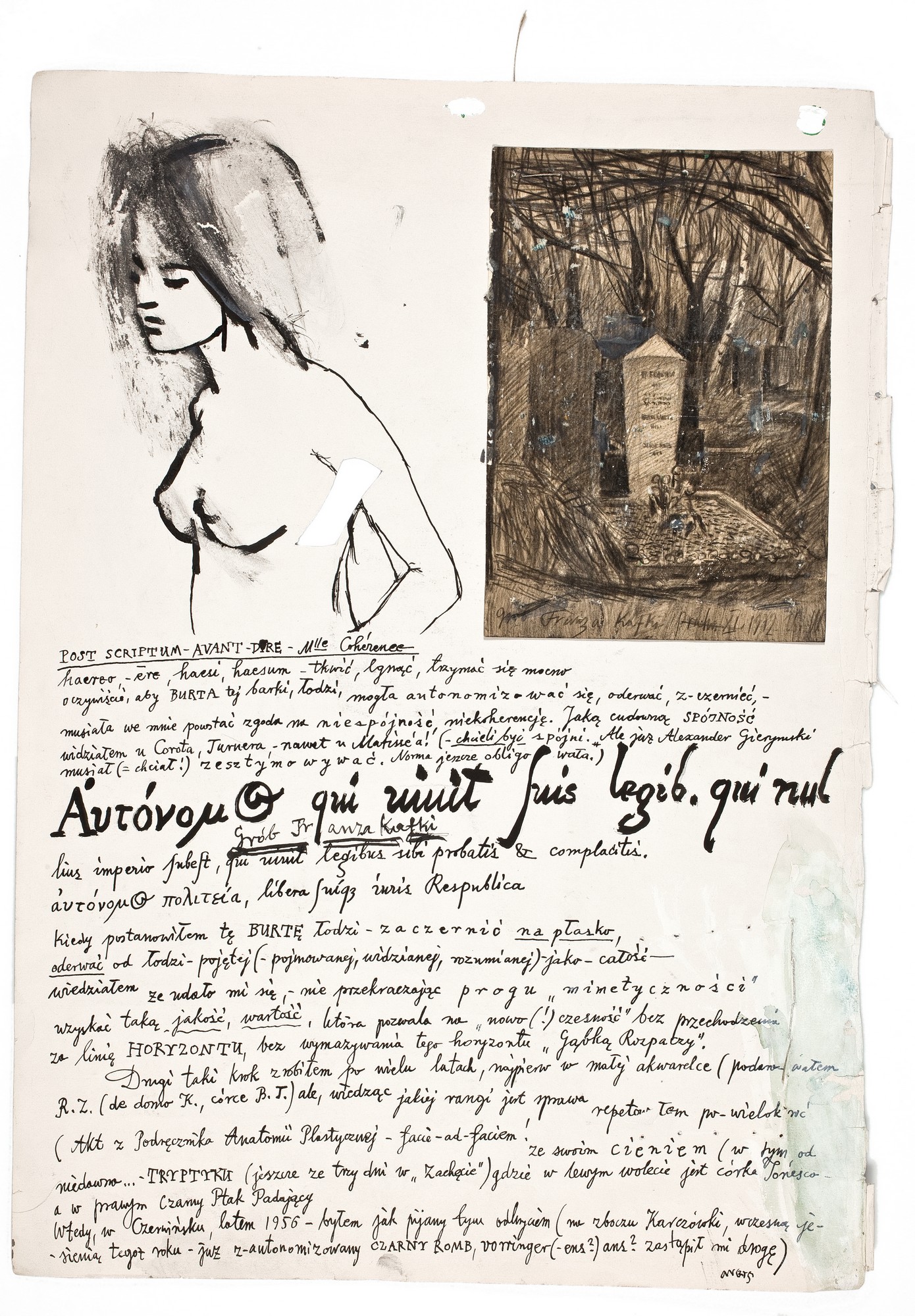 Karta brystolu ze śladami zeszycia wzdłuż prawej krawędzi. W lewym górnym rogu rysunek tuszem - półakt dziewczyny w ujęciu 3/4. Na fragmencie jej lewego ramienia oraz klatki piersiowej wycięty, wydłużony romb. Obok, w prawym górnym rogu naklejony rysunek w kolorze sepii z widokiem fragmentu Nowego Cmentarza Żydowskiego na Olszanach w Pradze z nagrobkiem Franza Kafki i jego rodziców. Dolna część karty wypełniona tekstem wykonanym tuszem drobnym pismem. Na odwrocie, u góry zarys fragmentu aktu kobiecego. Poniżej inskrypcja, na dole częściowo zarysowana tuszem.