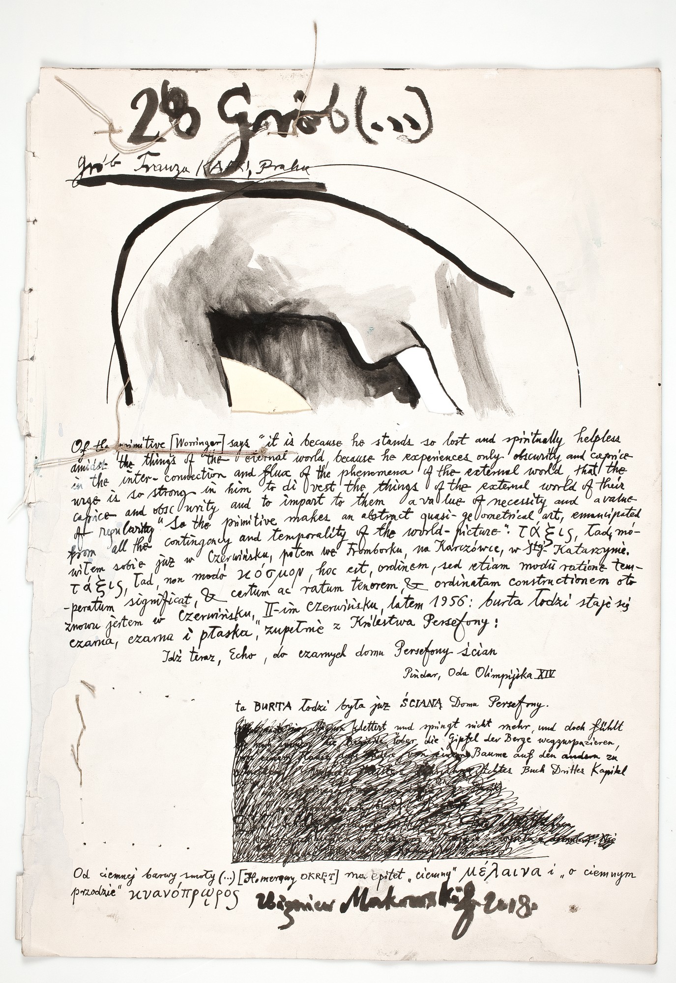 kredką, na rysunku nagrobka, d.: Grób Franza Kafki Praha XI. 1972; na odwrocie tuszem, śr.g.: 28 Grób (...) / Grób Franza KAFKI, Praha; poniżej, pod rysunkiem: Of the primitive [Worringer] says" it is becouse he stands so lostand spirutually helpless / amidst the things of tha eternal world, becouse he expriences only obcusity and caprice [...]; niżej: Idź teraz, Echo, do czarnych domu Persefony ścian / Pindar, Oda Olimpijska XIV / ta BURTA łodzxi była już ŚCIANĄ Domu Persefony. [...]; d.: Od ciemnej barwy smoły (...) [Homerowy OKRĘT] ma epitet "ciemny" [...]