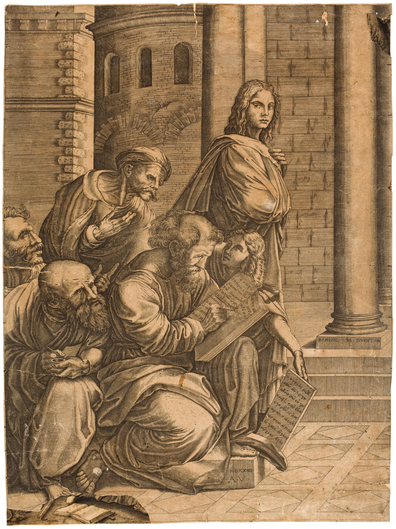 Inspiracją dla Agostina był fresk Szkoła Ateńska. Miedzioryt prezentuje grupę figuralną po lewej stronie pierwszego planu kompozycji, skupioną wokół postaci określanej najczęściej jako Pitagoras. Tu jednak, za Vasarim, grupa jest interpretowana w kontekście religijnym i prezentuje św. Mateusza w otoczeniu innych ewangelistów, ktoremu anioł (atrybut Mateusza; w innej interpretacji ta postać to Telauges, syn Pitagorasa, też filozof) podaje tabliczkę z tekstem jego Ewangelii. Także Bellori w "Descrizione delle immagini dipinte da Raffaello di Urbino nelle Camere del Palazzo Apostolico Vaticano" (Roma 1695) pisze o transformacji postaci Pitagorasa w ewangelistę przez Agostina Musiego.