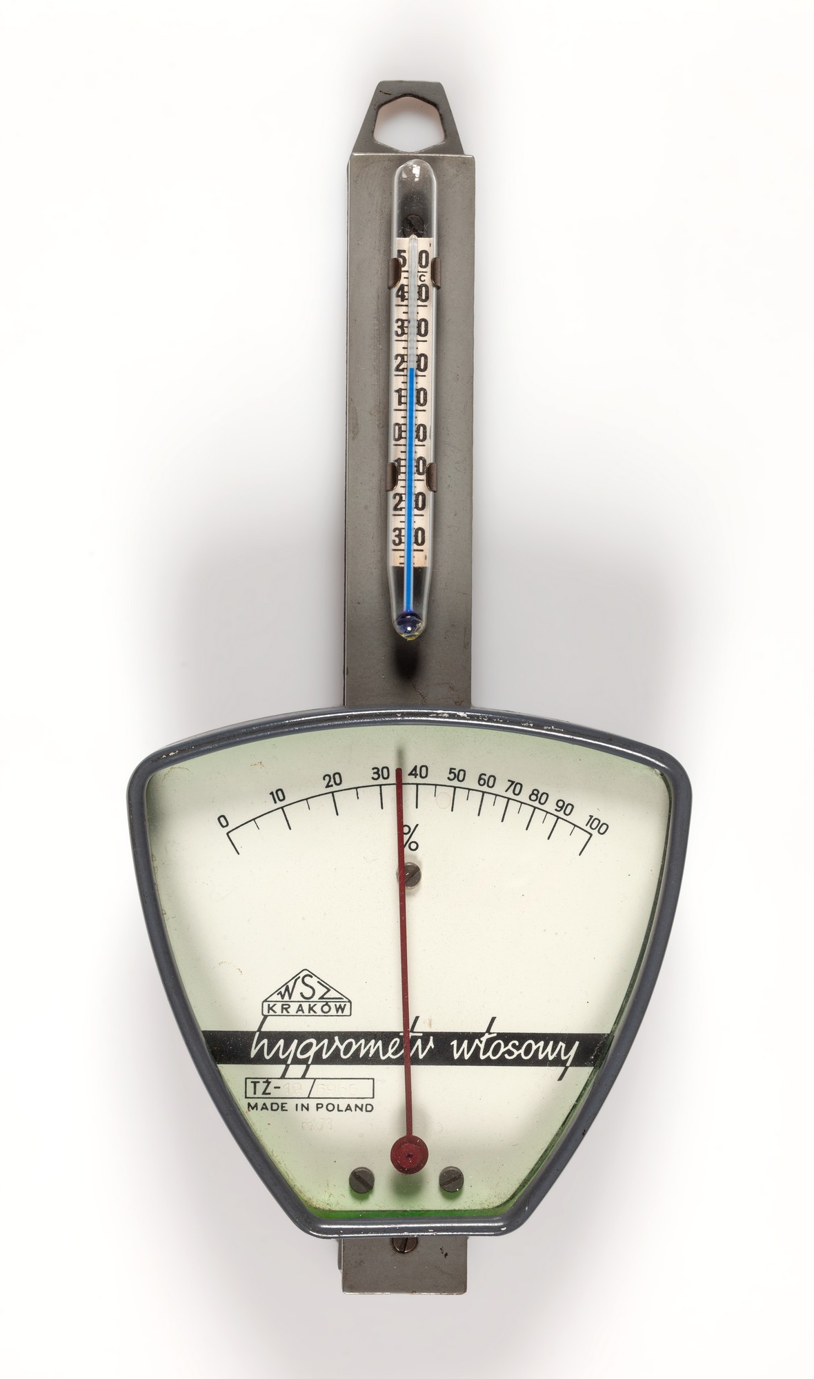 Higrometr (wilgotnościomierz) zbudowany z dwóch płaskich listew stalowych skręconych ze sobą (oddzielonych słupkami). Pomiędzy nimi zamocowany jest mechanizm włosowy zamocowany do osi wskazówki. Do dolnej części zewnętrznej listwy przykręcona jest trapezowata, metalowa puszka, od przodu przeszklona, ze wskazówką i tarczą z podziałką. Na tarczy znak producenta: w trójkatnym obramowaniu – WSZ, poniżej KRAKÓW, w prostokątnej ramce, poniżej napis: hygrometr włosowy.