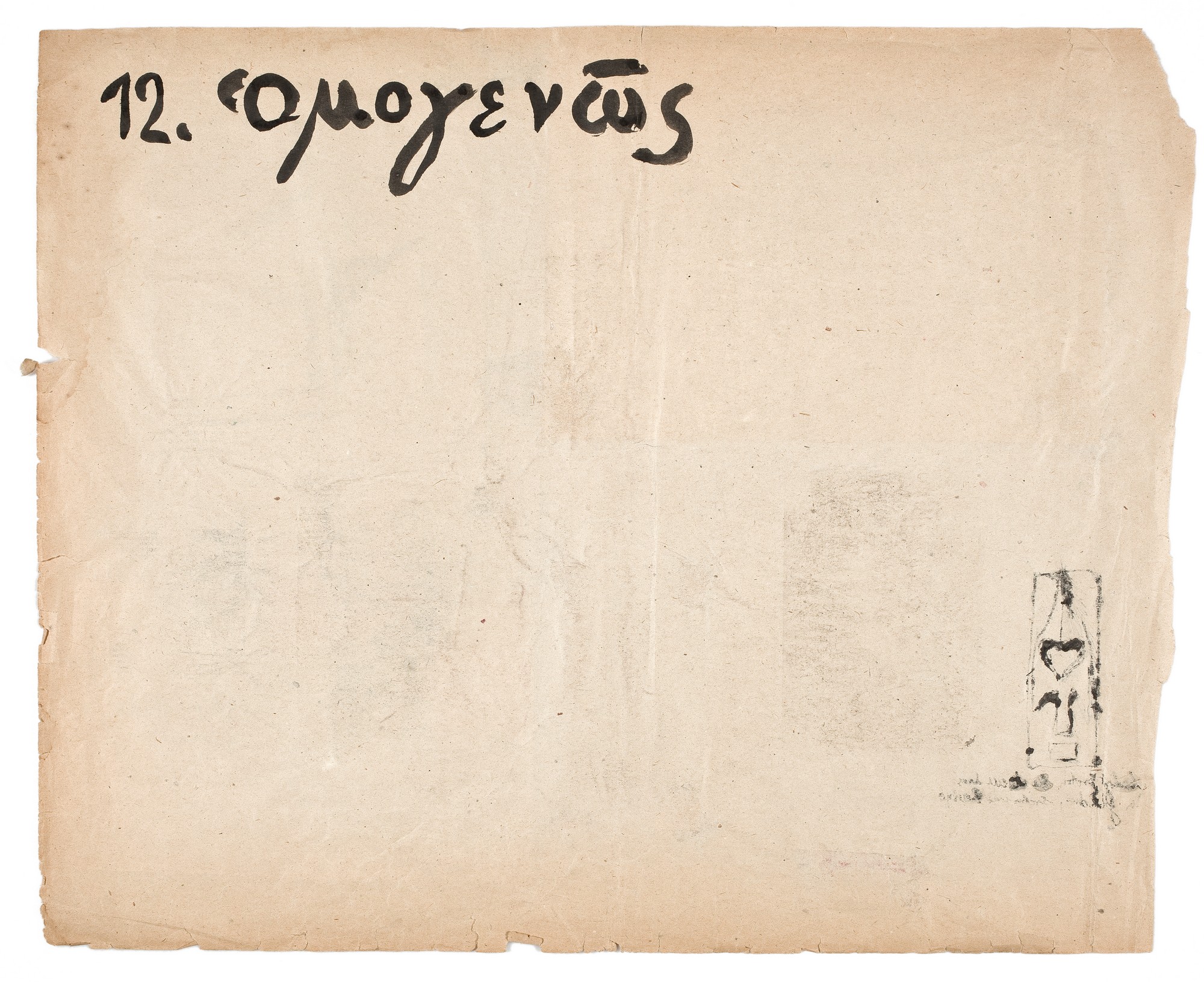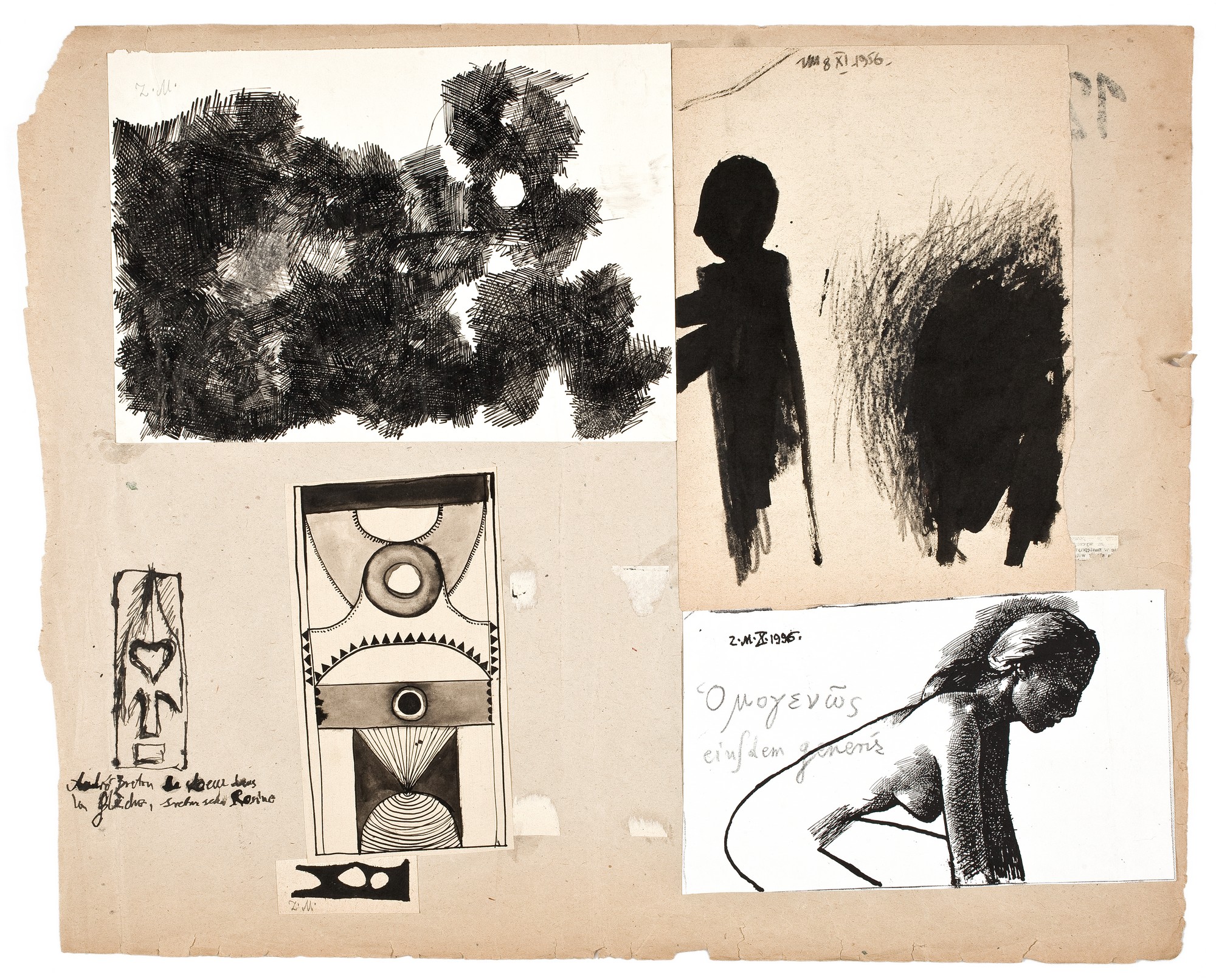Na szarym papierze naklejonych pięć rysunków: u góry po lewej stronie abstrakcja wykonana krórkimi, prostymi kreskami, rysunek obok przedstawia uproszczoną ludzką sylwetkę z profilu oraz na czarno zamalowaną plamę. Niżej akt młodej dziewczyny ujętek z boku, do kolan. trzy abstrakcyjne kompozycje, dwie z nich - naklejone