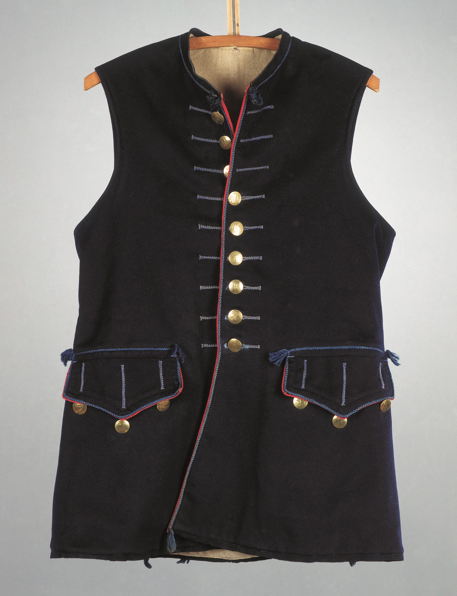 Brzegi obu przodów, patek przy kieszeniach oraz zewnętrznej patki z tyłu kamizelki podszyte są czerwonym suknem, tworzącym ozdobne wypustki; obszyte są ponadto ozdobnym jasnogranatowym sznureczkiem. Podszewka z materiału wełnianego w kolorze kremowym; kieszenie z płótna lnianego.
