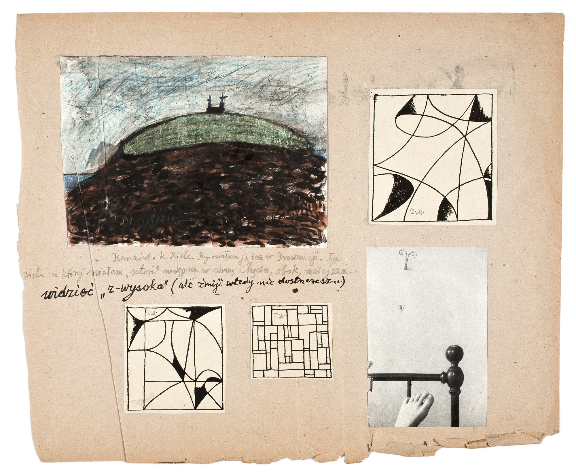 Arkusz szarego papieru z naklejonymi czterema rysunkami i jedną fotografią. Po stronie lewej u góry - rysunek gwaszem i kreką z widokiem wzgórza Karczówka z wieżami wczesnobarokowego kościoła św. Karola Boromeusza przy klasztorze pobernardyński, ob. księży pallotynów, w pasmie Gór Świętokrzyskich na terenie Kielc. Rysunek utrzymany w ciemnych, brunatno-zielonkawo-szaroniebieskich barwach. Niżej dwa geometryczne abstrakcyjne rysunki tuszem. Podobny rysunek - w prawym górnym rogu. Niżej - fotografia fragmentu ramy łóżka oraz gołej stopy.