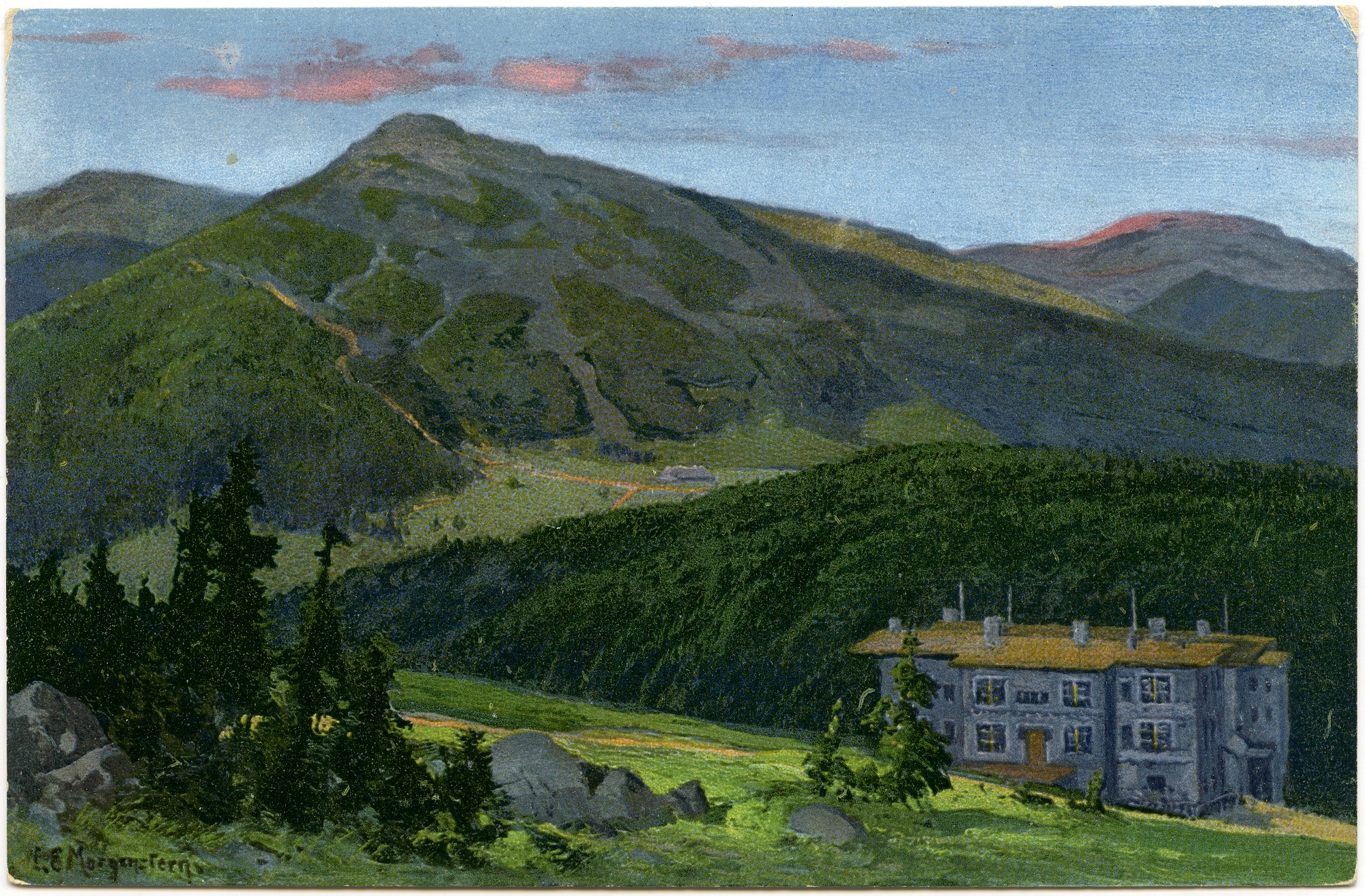 Reprodukcja obrazu C.E. Morgensterna (1847-1928) z widokiem Małego Szyszaka (1435 m), szczytu położonego w Głównym Grzbiecie Karkonoszy. Po prawej stronie widoczne czeskie schronisko "Pertova bouda" ("Peterbaude").