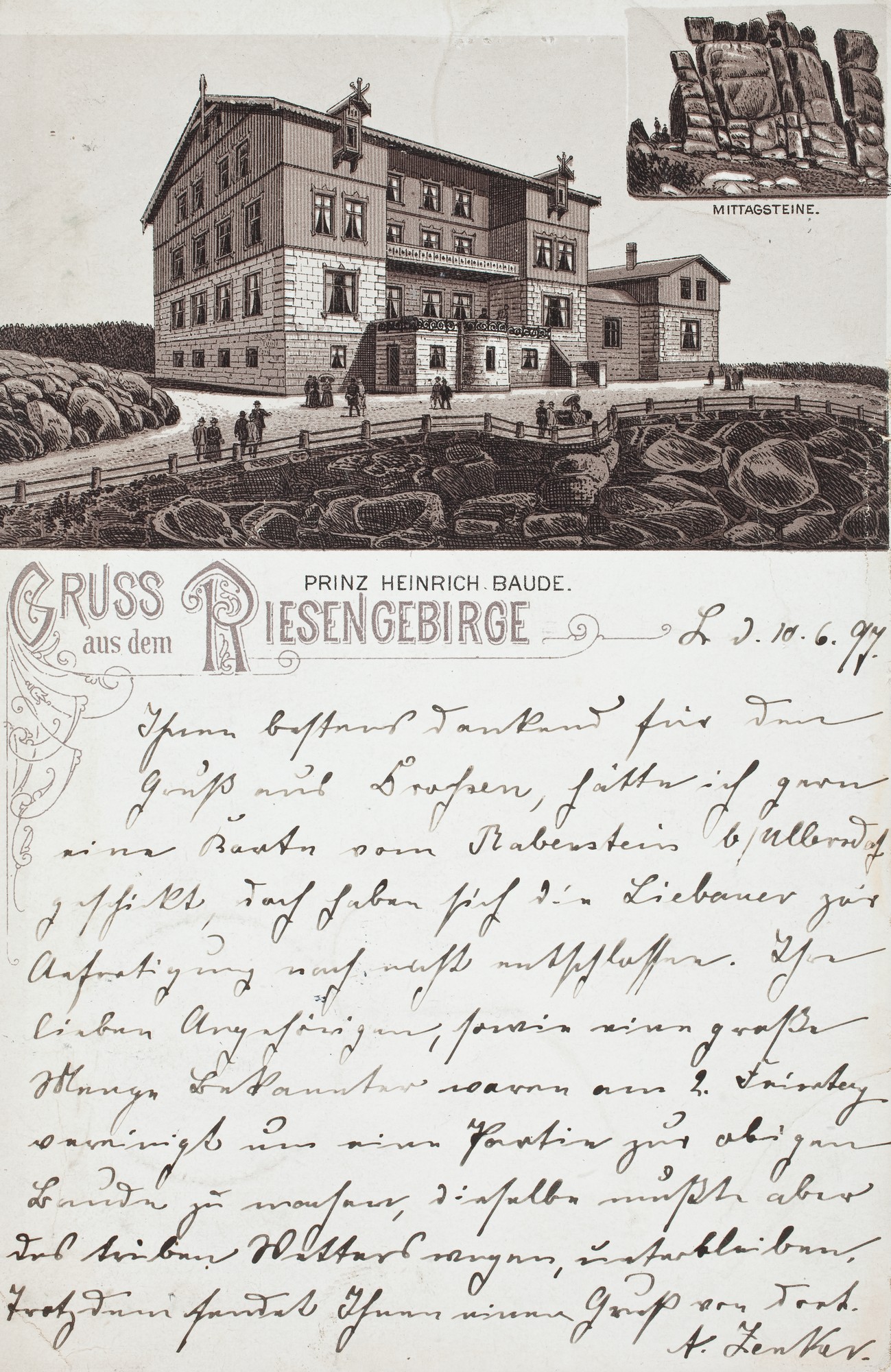Schronisko wybudowane w latach 1888-1898 przez Riesengebirgsverein (Towarzystwo Karkonoskie) na krawędzi Kotła Wielkiego Stawu (1410 m). Początkowo miało nosić nazwę "Schronisko przy Słoneczniku" ("Baude am Mittagstein"), ale po wizycie w 1888 roku księcia Henryka von Hohenzollerna, brata cesarza Wilhelma II, na jego cześć zmieniono nazwę na "Prinz Heinrich Baude". W latach 30. XX wieku dokonano przebudowy pod kierunkiem braci Albert z Jeleniej Góry. W 1946 roku spłonęło. Na mniejszym widoku grupa skalna Słonecznik (Mittagsteine).
