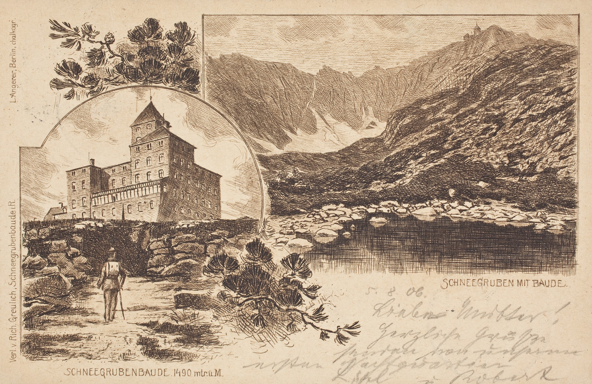 Korespondencja w języku niemieckim, daty dwóch stempli: 6.8.06 i 7.8.06, znaczek o wartości 5 Pf, pieczątka pamiątkowa: Schneegrubenbaude Richard Greulich - 5.8.1906.
