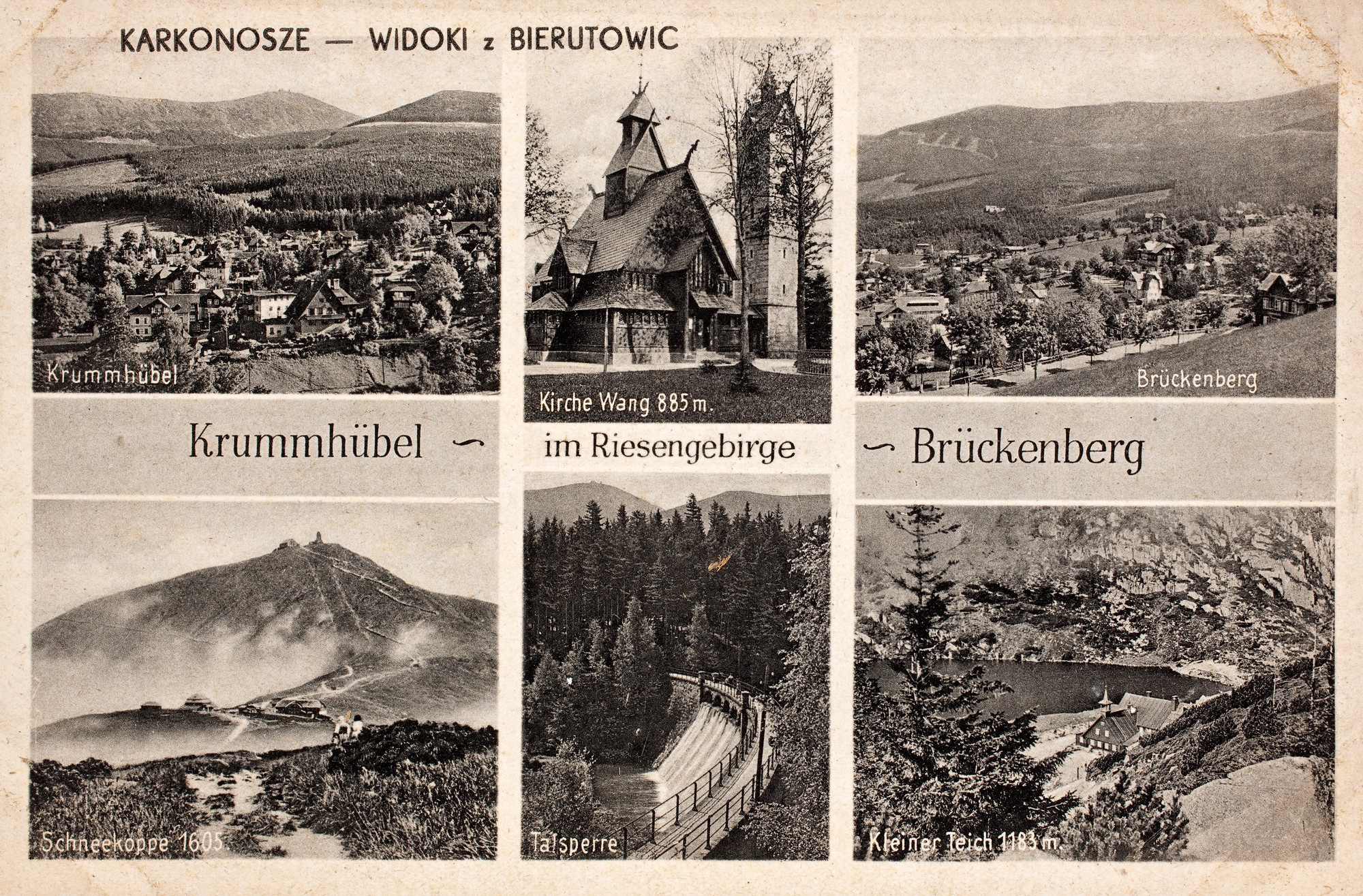 Krummhübel; Kirche Wang 885 m.; Brückenberg; Scneekoppe 1605.; Talsperre; Kleiner Teich 1183 m.