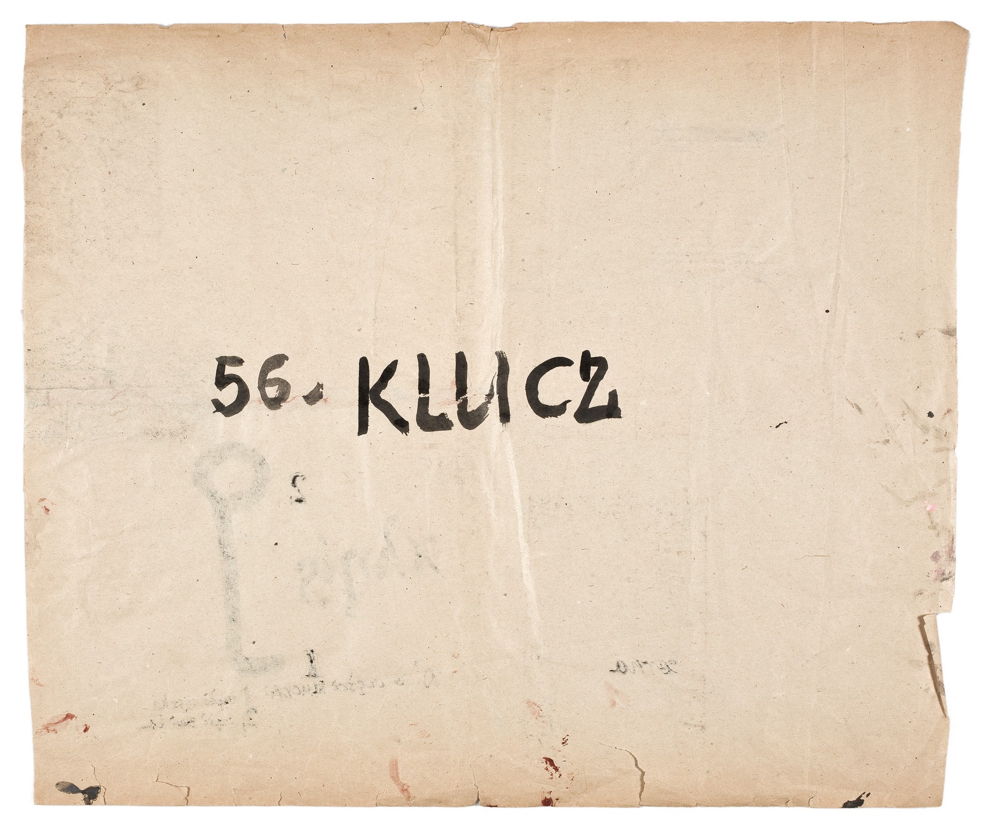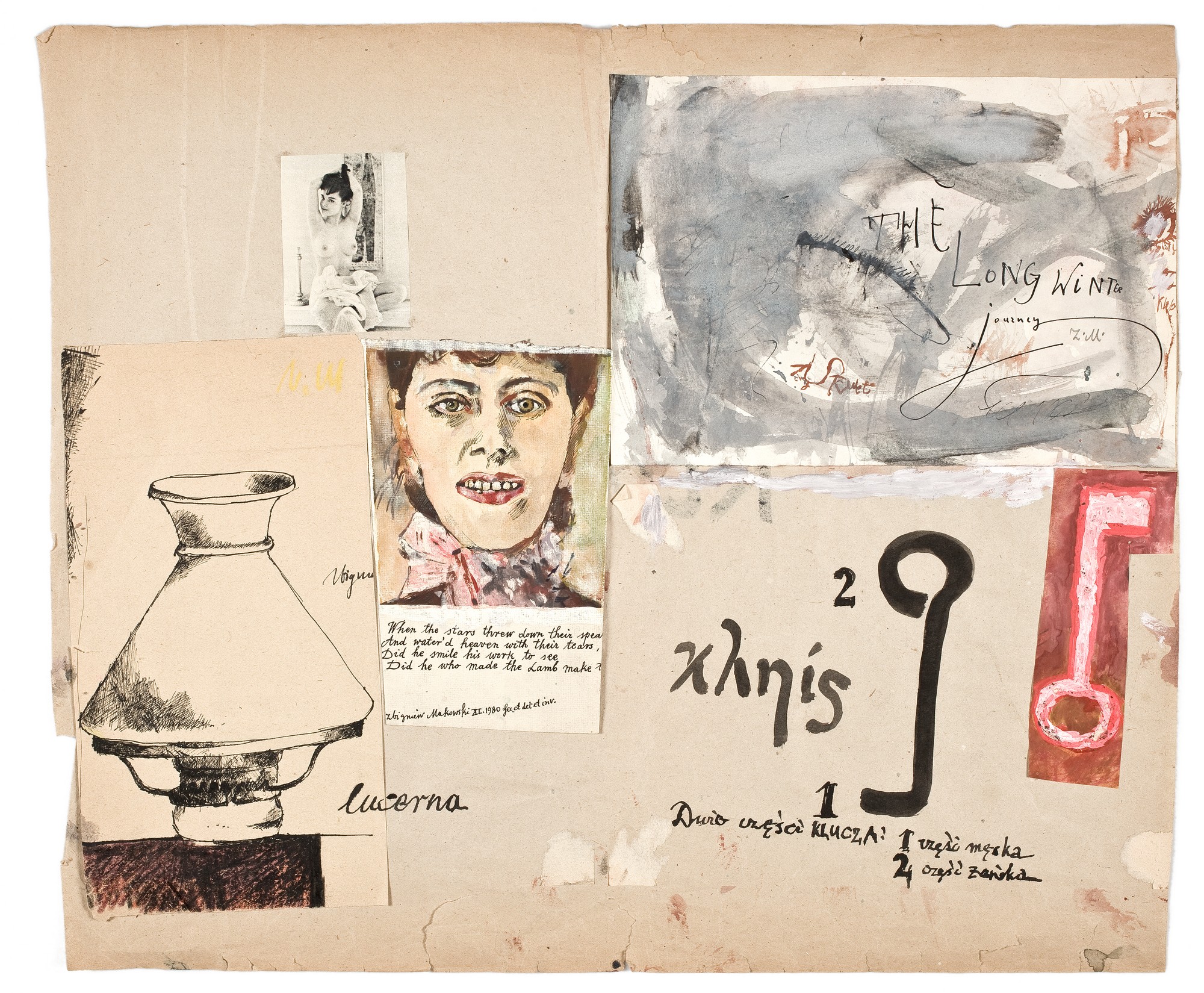 Tuszem, bezpośrednio na szarym papierze, p. d.: 2 / (słowo klucz po grecku) / 1 / Dwie części KLUCZA: 1 część męska / 2 część żeńska; tuszem, l.d.: l.d.: lucerna; na zamalowanej kartce (p.g.), pośr.: THE / LoNG WiNTER / journey; tuszem na odwrocie pośr.: 56. KLUCZ