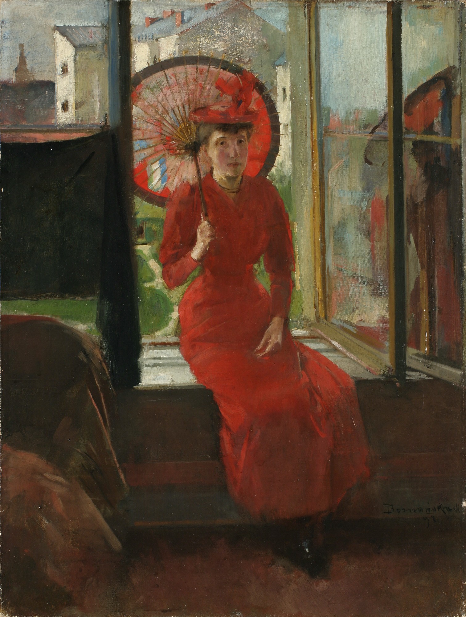 Jaskrawa czerwień sukni i kapelusza, dopasowana do koloru parasolki jest elementem bardzo wówczas modnej dalekowschodniej stylizacji. W różnych strojach tego koloru występują "Japonki" malowane np. przez Dębickiego, Wyczółkowskiego i Pankiewicza. Wnętrze ukazuje pracownię Boznańskiej w Monachium, tytułowa parasolka została utrwalona na fotografiach artystki (np. w chińskim kaftanie) oraz na kilku obrazach z tego czasu. Niedawno pojawiły się wątpliwości, czy modelką tego portretu jest rzeczywiście sama autorka.