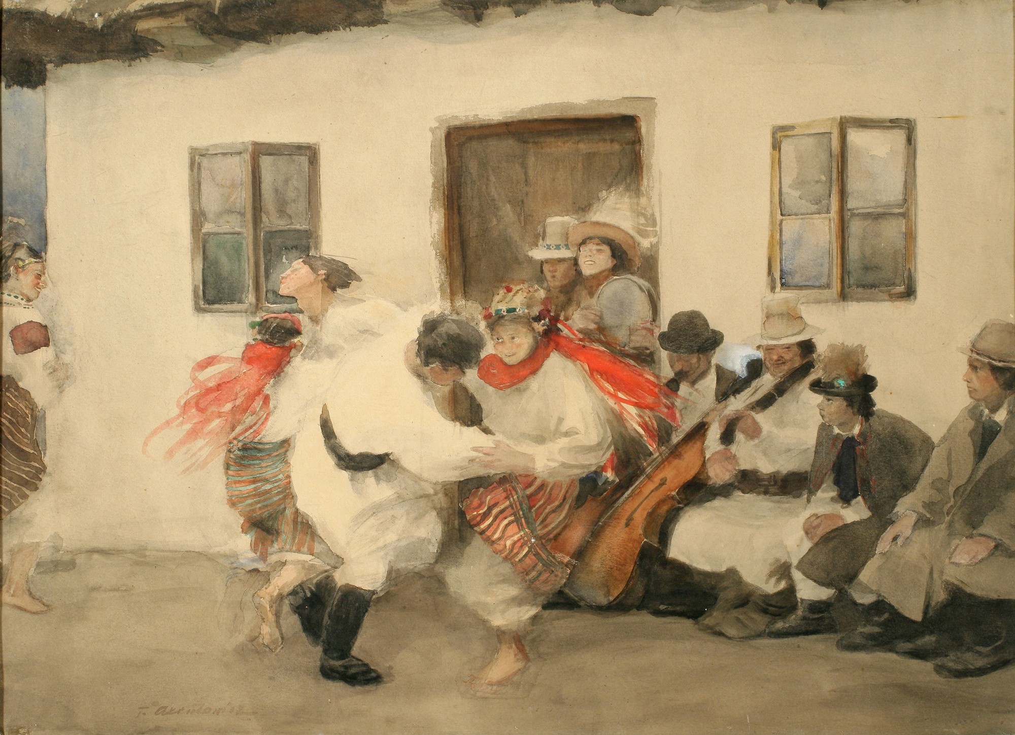 Ukazany taniec nazywano oberkiem lub kujawiakiem, ponieważ nie wszystkie akcesoria ubiorów (np. niektóre kapelusze mężczyzn, zapaski dziewcząt w pasy nie poziome, lecz pionowe) są jednoznacznie huculskie, zdecydowanie zaś nie z tych okolic jest pobielana ściana chałupy w tle. Trzecia, najszybsza część huculskiej kołomyjki ("mknąca z góry"), którą przedstawił Axentowicz, przypomina oberka i – jak pisał Eligiusz Niewiadomski – jest tak zawrotnie szybka, "że oko nie chwyta już sylwety i linie konturów zacierają się jak na migawkowej fotografii".