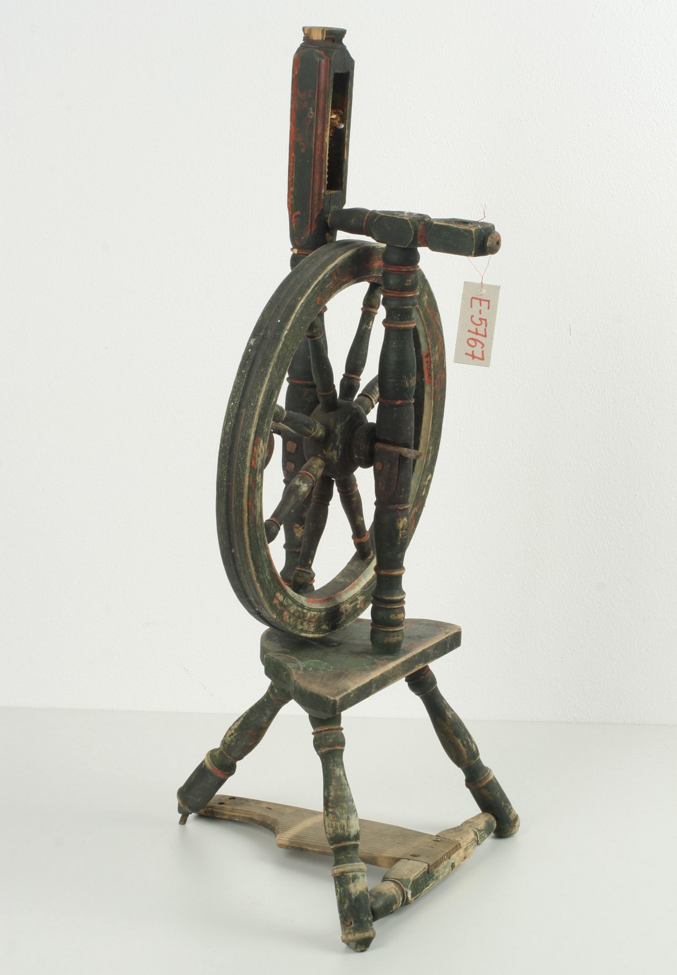 Pod spodem stołka poziomy pedał, wykonany z jednej listewki, wsparty na osi obsadzonej pomiędzy dwiema nóżkami. Nóżki stołka, słopce, szprychy koła oraz elementy obudowy widełek ozdobnie toczone. Na wszystkich częściach kołowrotka polichromia: ciemnozielona, brązowa, czerwona oraz biała; na kole zatarte motywy roślinne. Brak widełek (wrzeciona), szpuli, krążka napędzającego widełki, sznurka transmisyjnego (łączącego widełki z kołem) oraz "parobka" wprawiającego koło w ruch.