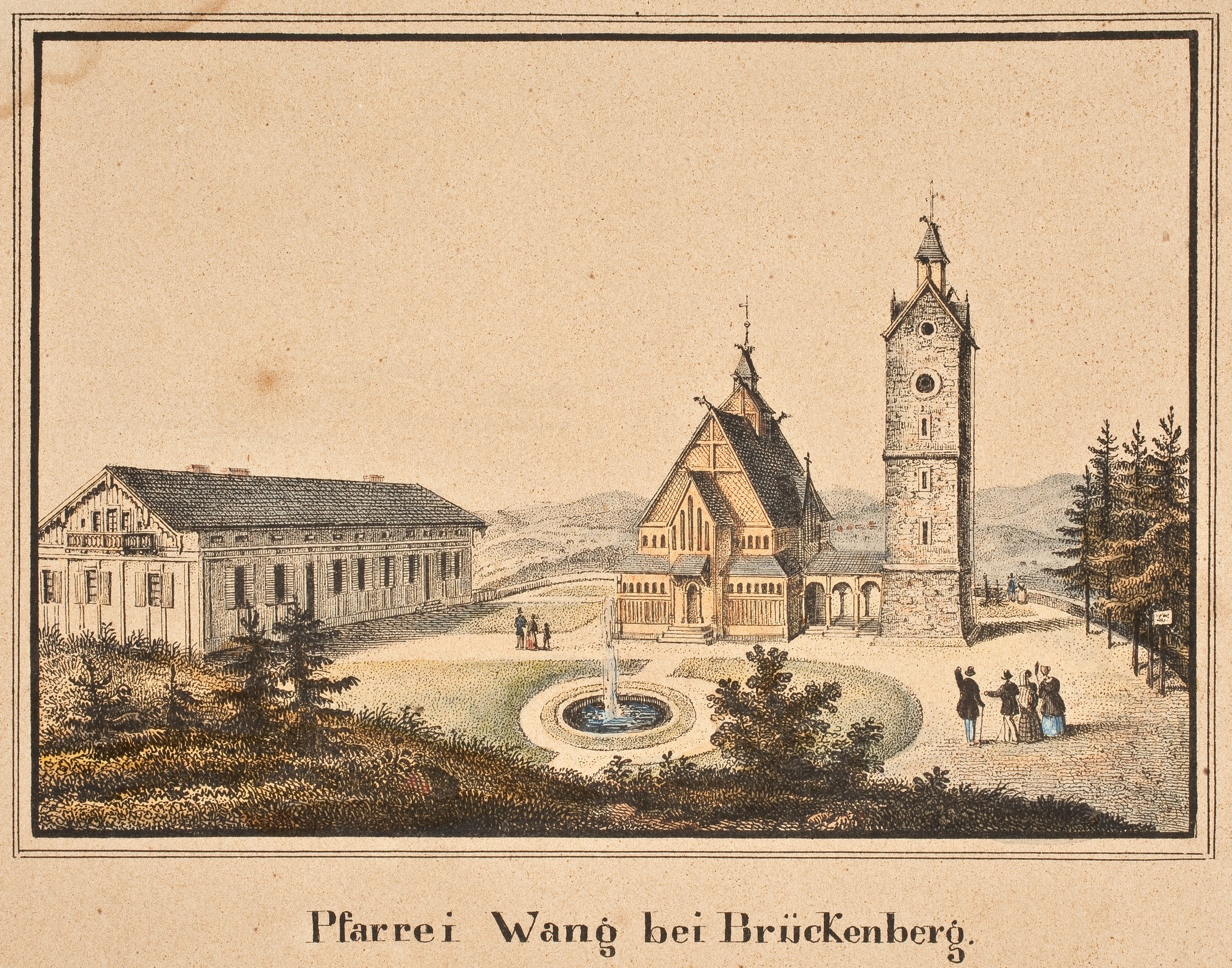 Nowa historia kościółka Wang rozpoczęła się w 1840 roku, gdy malarz Johann Christian Clausen Dahl zakupił dla króla Fryderyka Wilhelma IV przeznaczony do rozbiórki budynek. Początkowo zamierzano usytuować go na Pawiej Wyspie niedaleko Poczdamu, w końcu jednak dzięki zabiegom właścicielki pobliskiego Bukowca, hrabiny Frederike von Reden (zm. 1854), ustawiono go w Karpaczu Górnym na wysokości 885 m n.p.m., tworząc górską parafię dla okolicznych mieszkańców. Romantycznym "dodatkiem" do kościoła była wolno stojąca wieża zaprojektowana przez architekta Augusta Stülera, prawdopodobnie zgodnie ze szkicowymi instrukcjami króla. Kościół poświęcono w 1844 roku w obecności pary królewskiej. Mimo kulturowej obcości kościółek szybko wpisał się w karkonoski krajobraz, stał się atrakcją turystyczną i niezwykle częstym motywem malarskim. Rok później postawiono widoczny na litografii po lewej budynek pastorówki (wg projektu architekta C. Hamanna).