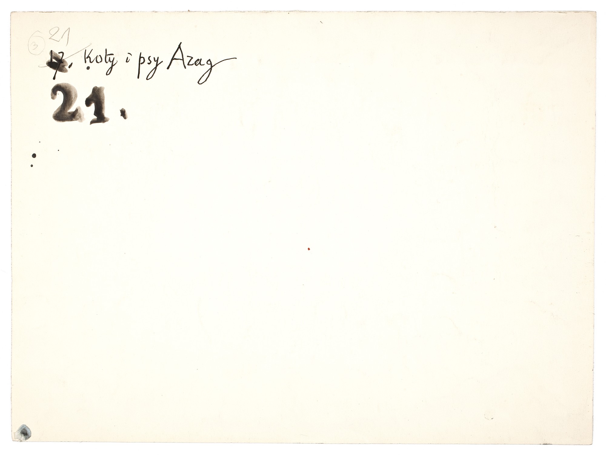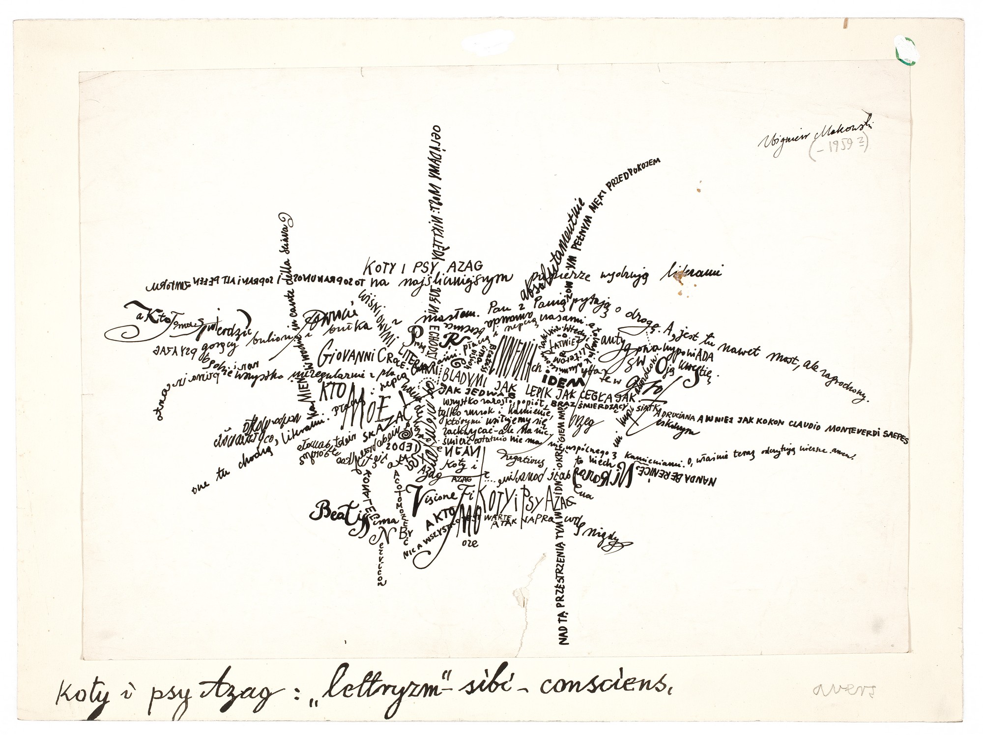 Kartka naklejona na grubszy papier. Na kartce widnieją napisane tuszem różne wyrazy i zdania w różnych konfiguracjach i w kilku językach, m.in. po polsku, po grecku, po łacinie. Stanowia swoisty manifest lettryzmu.
