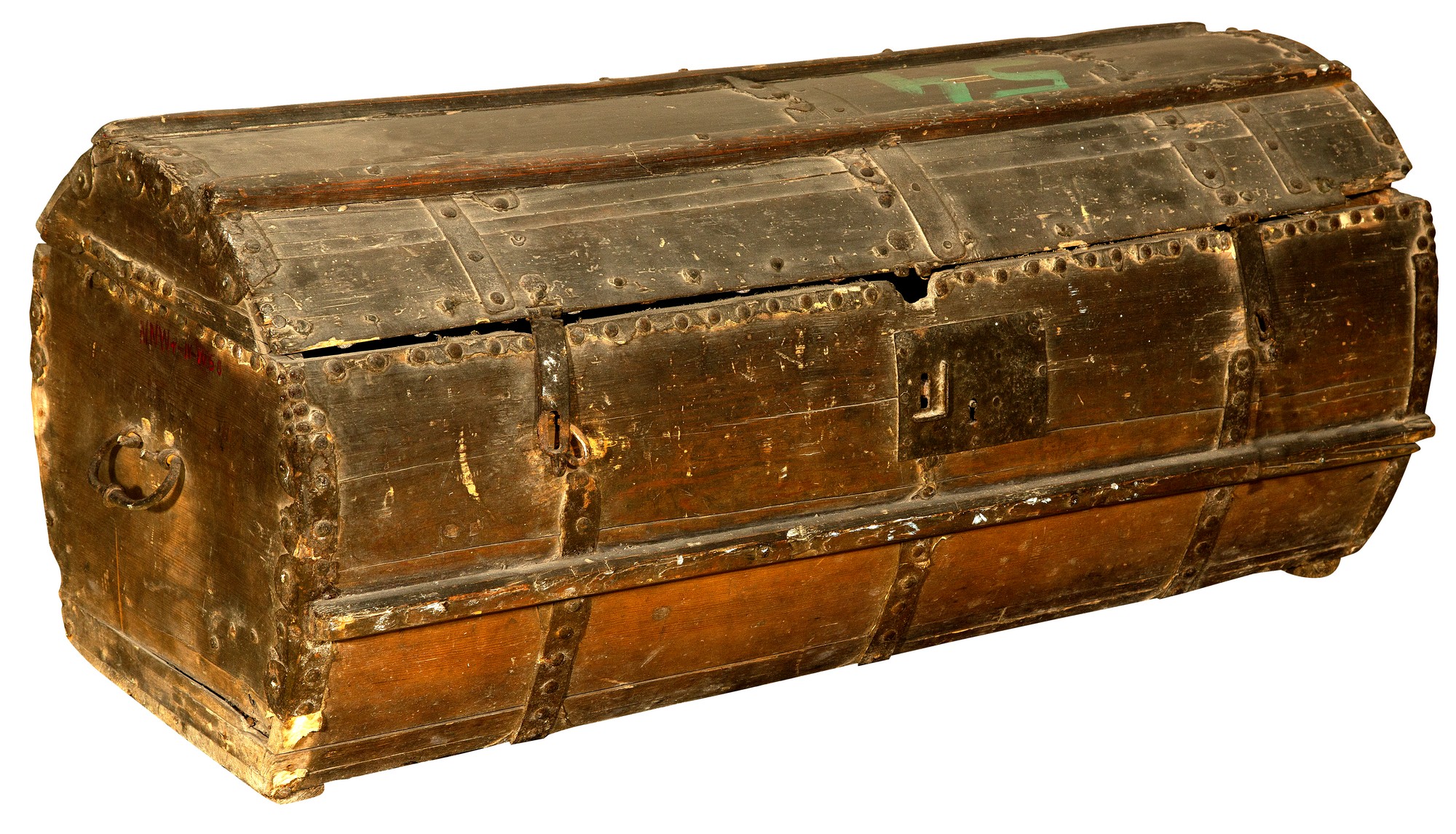 materiał: drewno sosnowe, żelazo (okucia), skóra (częściowo zachowana)