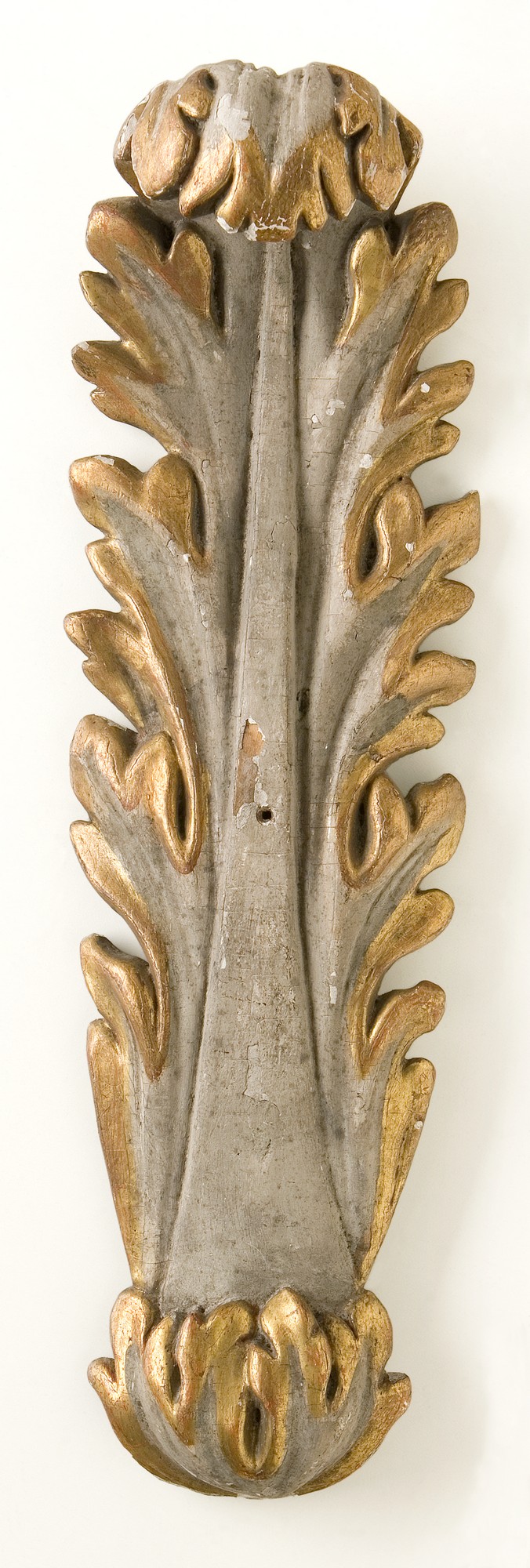 Liść akantu w formie palmety. Biała polichromia, złocenia.