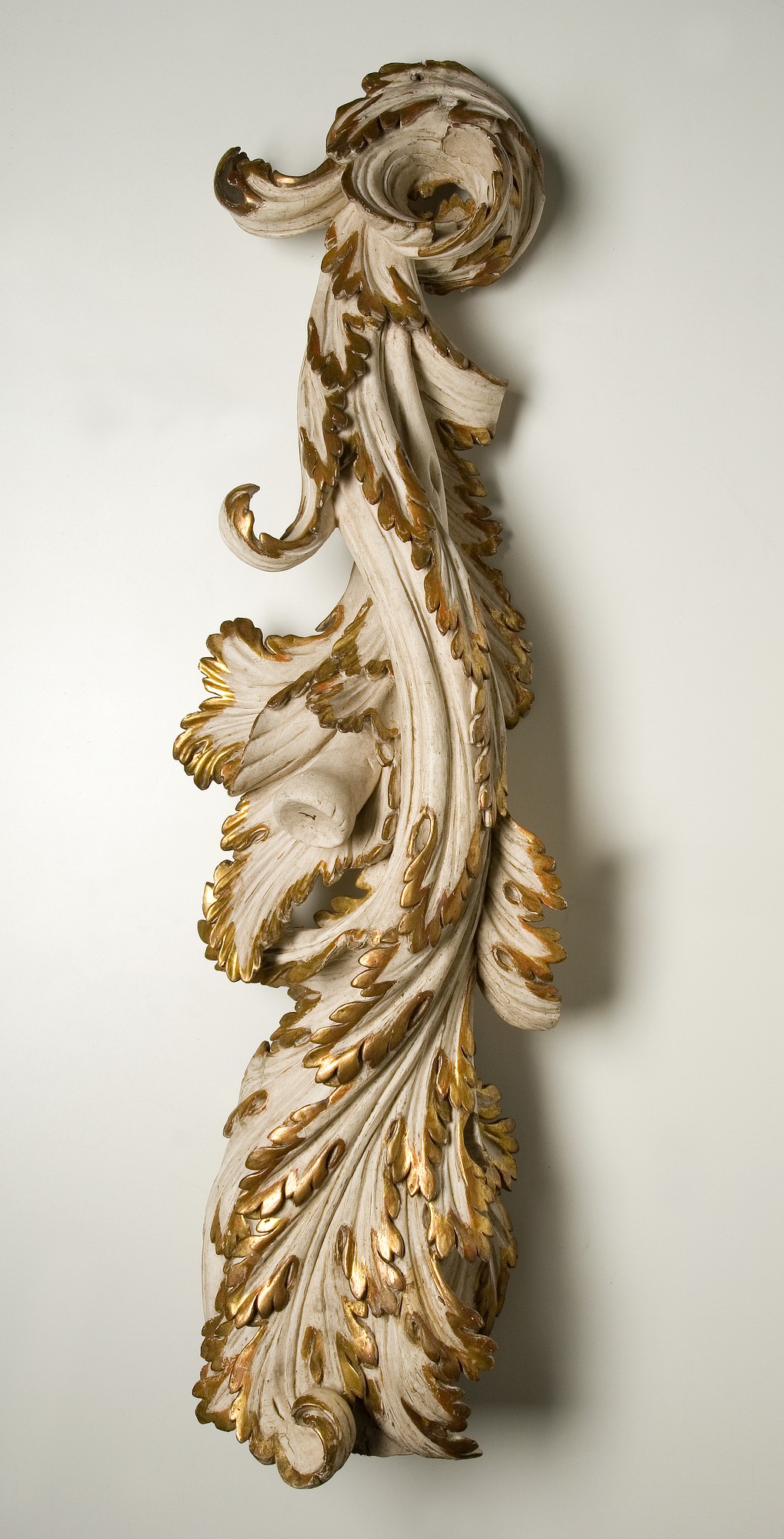 Stylizowany, skierowany w dół liść akantu. Biała polichromia, złocenia.