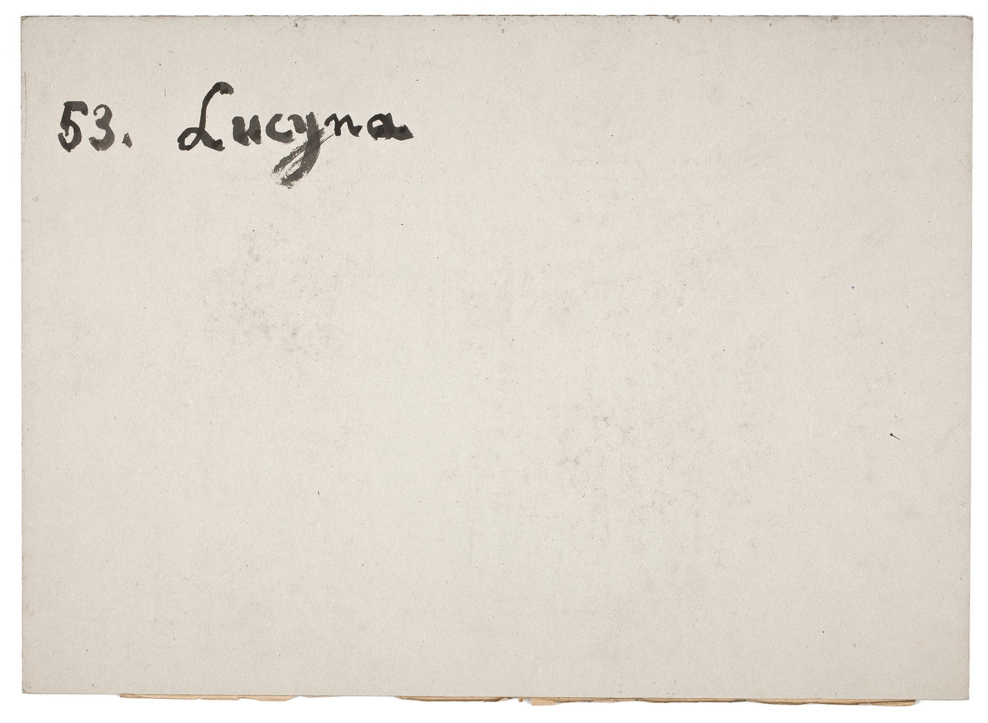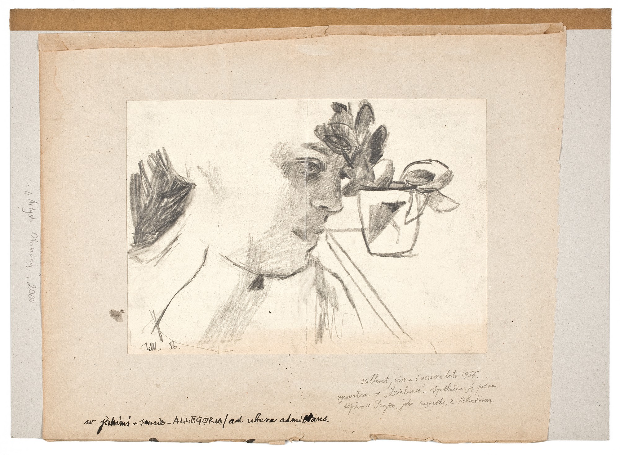 Tuszem, na tekurze, l.d.: w jakimś sensie ALLEGORIA / ad ubera admittans; ołówkiem, p.d.: scilleret, wiosna i wczesne lato 1956 / rysowałem w "Dziekance". Spotkałem ją potem / dopiero w Paryżu, jako mężatkę, z Kokoszkówną.; na odwrocie (tektury), tuszem, l.g.: 53. Lucyna