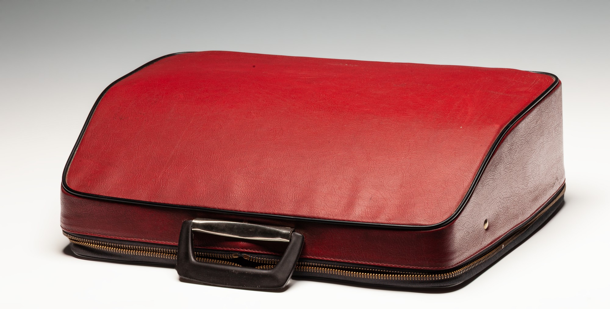 Walizka wykona z tektury w zewnętrznej okleinie z czerwonej sztucznej skóry, od wewnątrz okleina tkaninowa, flanelowa. Podstawa w której mocuje się maszynę i pokrywa zamykane na zamek błyskawiczny. Do górnego boku zamocowana w metalowej podstawie plastikowa, prostokątna, czarna rączka.