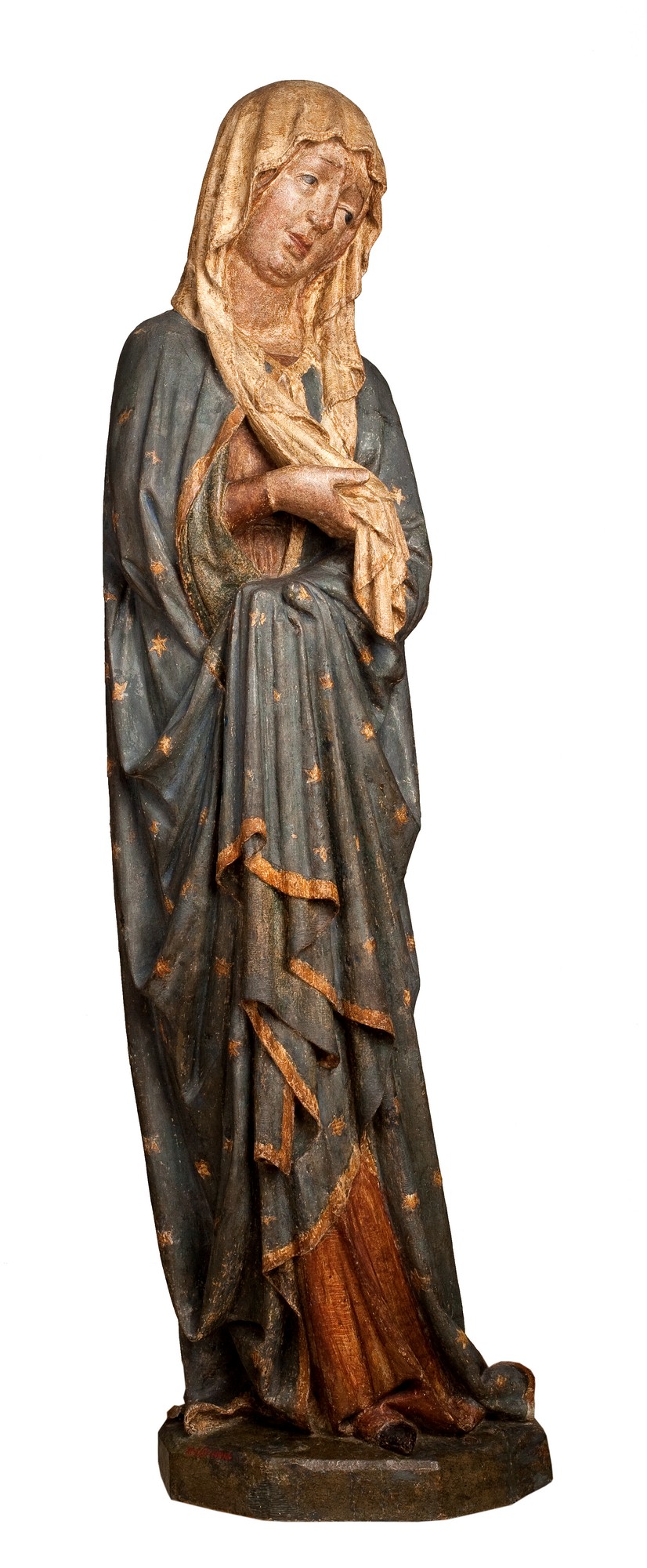 Figura Matki Boskiej należy do sześcioosobowej, monumentalnej grupy Ukrzyżowania, która pierwotnie znajdowała się na belce tęczowej kościoła pw. św. Elżbiety we Wrocławiu. Około 1830 roku zespół ten zmienił swoje miejsce w obrębie świątyni, kiedy to wraz z częścią belki przeniesiony został do północnej nawy i umieszczony ponad wejściem do zakrystii. Grupa opuściła kościół pw. św. Elżbiety dopiero w 1944 roku – w obawie przez zniszczeniami wojennymi została wywieziona i zabezpieczona w Lwówku Śląskim. Po zakończeniu wojny powróciła do Wrocławia – od roku 1948 przechowywana była w Muzeum Państwowym (obecnie Muzeum Narodowe we Wrocławiu), a dwanaście lat później włączono ją do zbiorów tej instytucji. Od 1987 roku cały zespół prezentowany jest na wystawie stałej "Sztuka Śląska XV-XVIII wieku ze zbiorów Muzeum Narodowego we Wrocławiu" w Muzeum Piastów Śląskich w Brzegu.