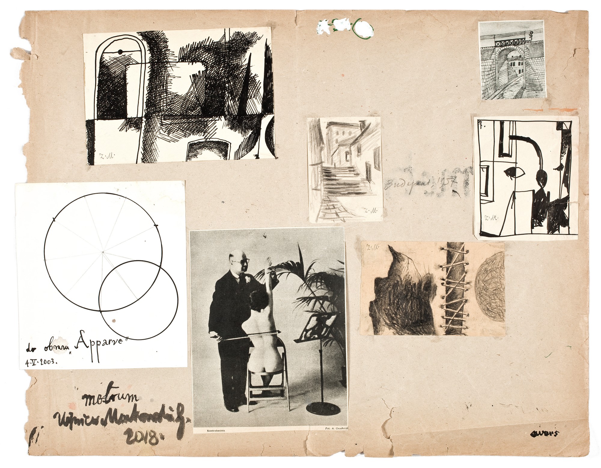 Arkusz szarego papieru z naklejonymi pięcioma rysunkami, jedną reprodukcją i jedną fotografią prasową z kontarbasistą a'la Man Rey.