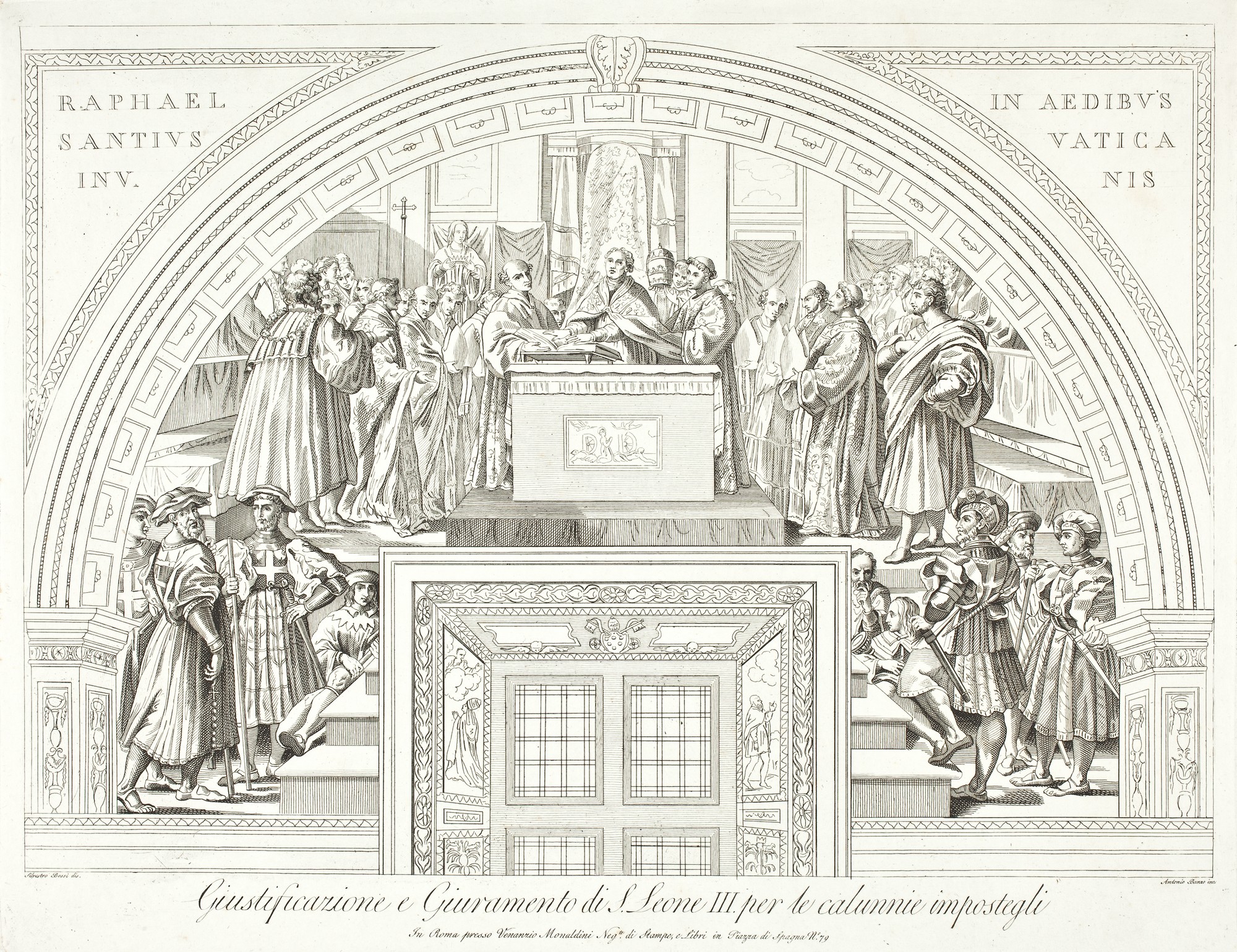 u dołu pośrodku: Giustificazione e Giuramento di S. Leone III. Per le calunnie impostegli /In Roma presso Venanzio Monaldini Neg.te di Stampe, e Libri in Piazza di Spagna N.o 79.