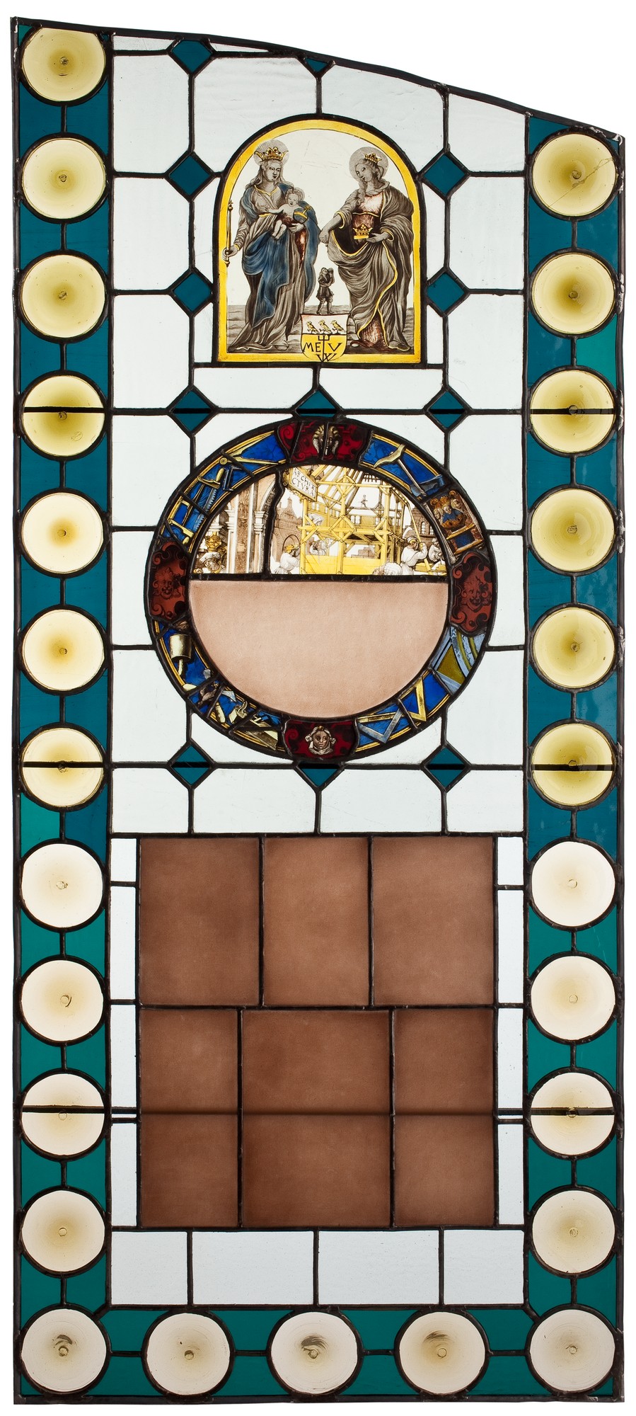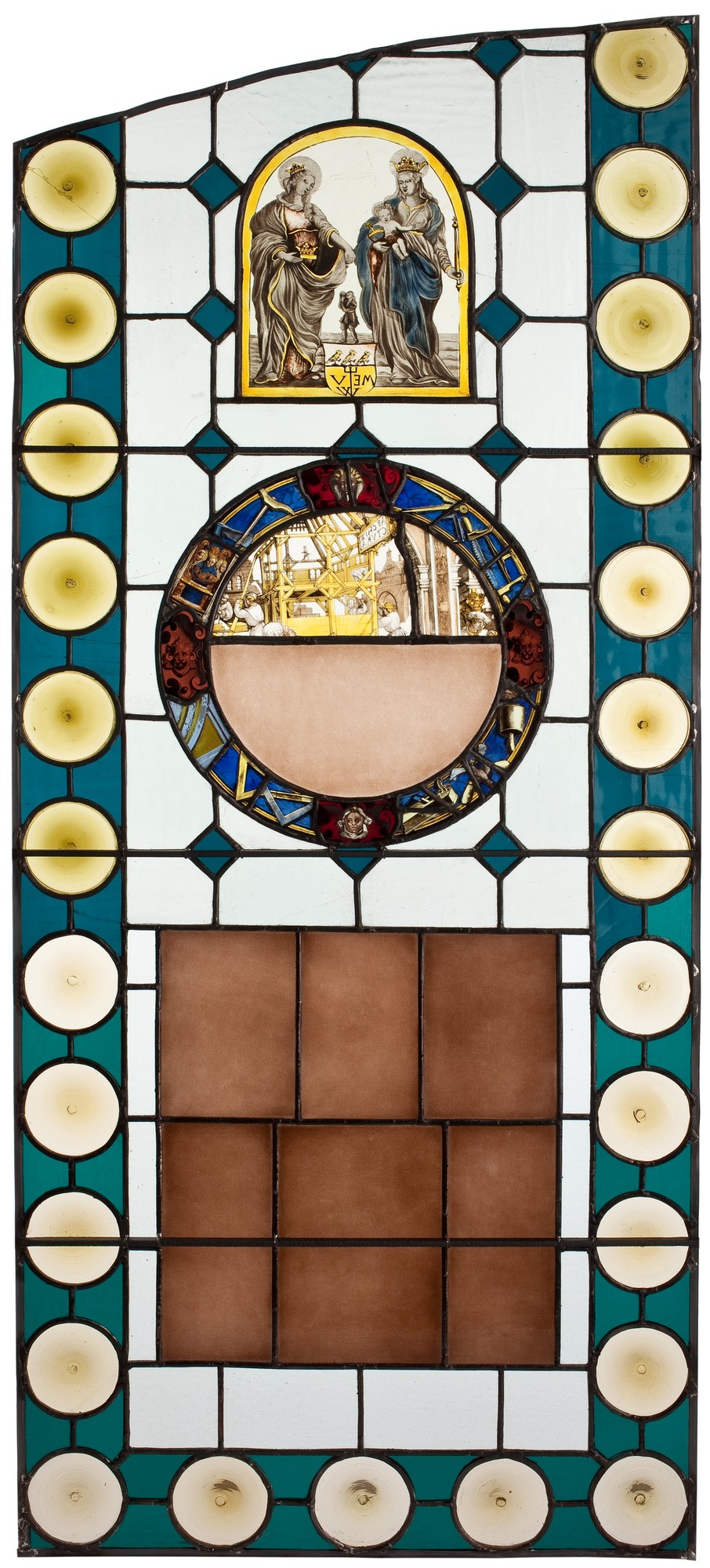Kwatera – w kształcie zbliżonym do prostokąta, zamknięta u góry odcinkiem łuku – po bokach i u dołu obramowana bordiurą z niebieskiego szkła z kolistymi żółtymi gomółkami. Główne pole wypełnione oszkleniem z czworobocznych szybek zielonkawych i niebieskich. Na osi umieszczone dwa witraże: z Madonną z Dzieciątkiem, św. Elżbietą Węgierską i z alegorią Architektury.