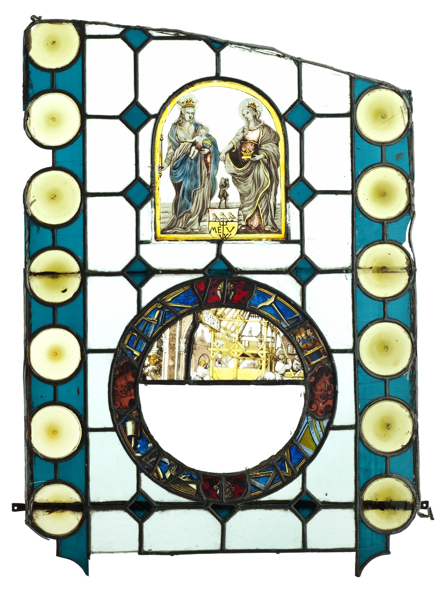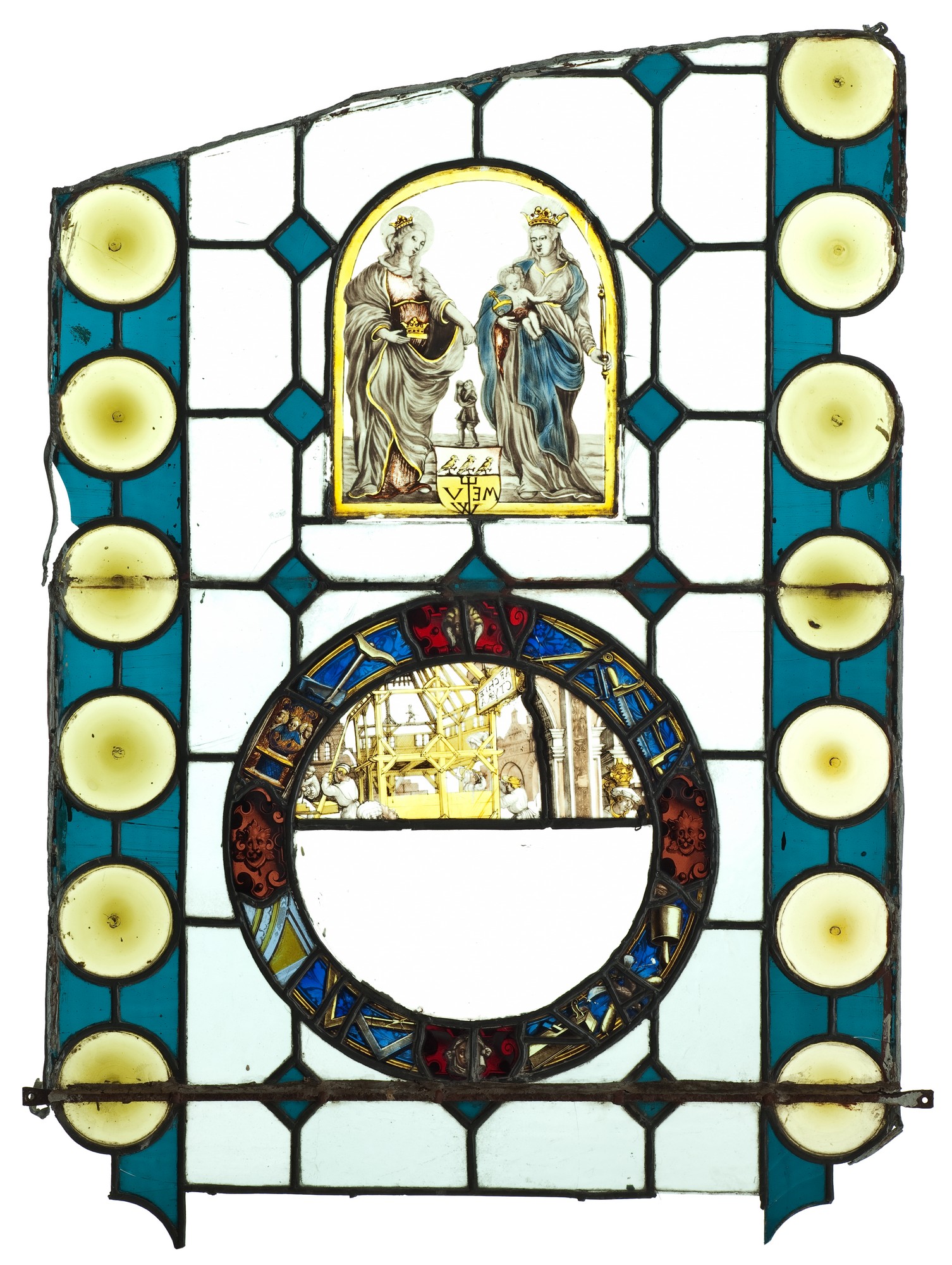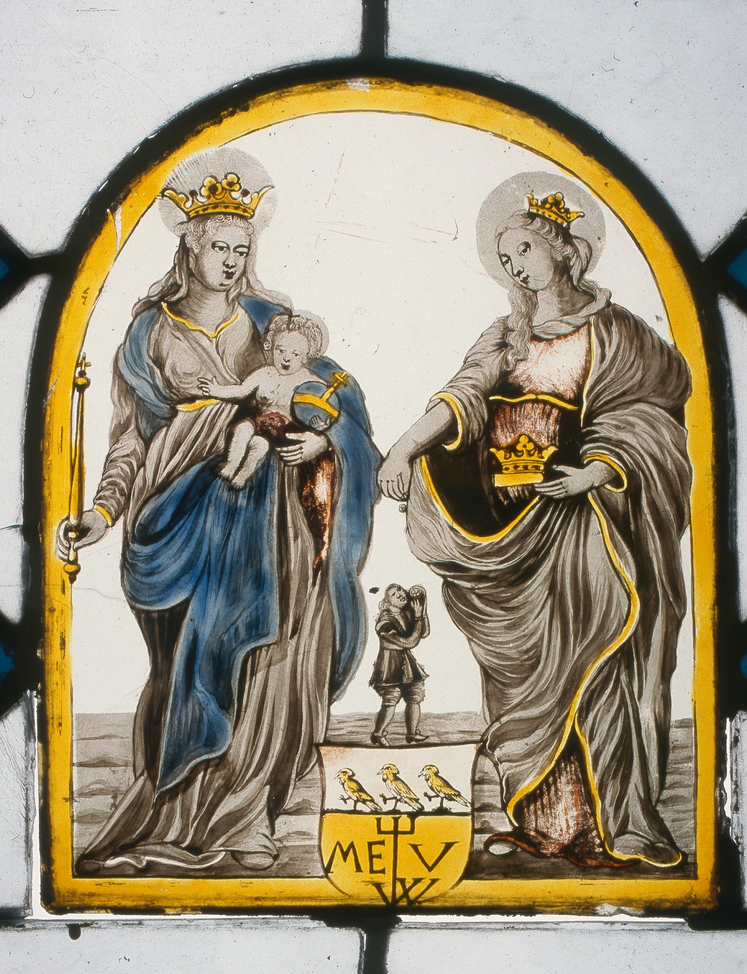 W prostokątnym polu zamkniętym łukiem po lewej stronie Maria (w typie ikonograficznym Regina Coeli) w białej sukni i w niebieskim płaszczu z czerwonym podbiciem. Na lewym ramieniu podtrzymuje Dzieciątko, w prawej ręce trzyma berło. Po prawej postać św. Elżbiety w czerwonej sukni i w szarym płaszczu. W lewej ręce trzyma księgę, na niej złota korona. Prawą ręką rzuca monetę do mieszka ubogiego, którego nieproporcjonalnie mała postać umieszczona pomiędzy Marią i Elżbietą. Poniżej jego postaci biało-złota tarcza herbowa, dzielona poziomo na pół: w górnym białym polu trzy złote ptaki, w dolnym złoty gmerk rzemieślniczy i litery: ME—V / W. Witraż malowany i lawowany en grisaille.