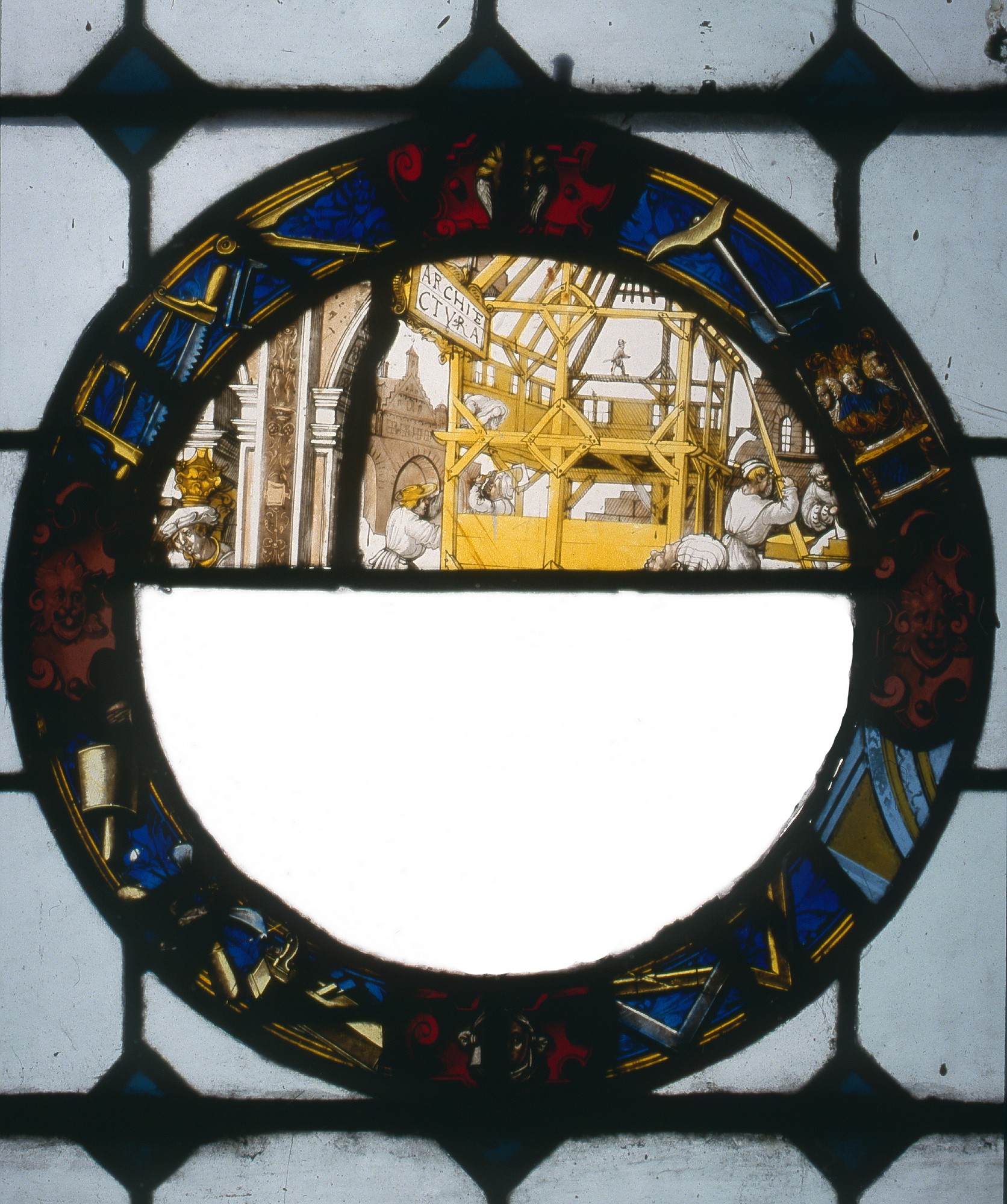 W kolistej barwnej bordiurze zachowana górna połowa pola obrazowego. W centrum kompozycji widoczny drewniany szkielet budowli (żółta lazura) i pracujący przy budowie ludzie w krótkich kaftanach i w czapkach. Postacie malowane en grisaille z elementami żółtej lazury. U góry po lewej umieszczona ukośnie tablica w rollwerkowych ramach z napisem: ARCHITE / CTVRA. W bordiurze umieszczone na osiach cztery czerwone kartusze rollwerkowe z maszkaronami i główkami, malowane en grisaille oraz żółtą lazurą. Na pozostałych polach na niebieskim tle narzędzia ciesielskie w kolorach żółtym i jasnoniebieskim.