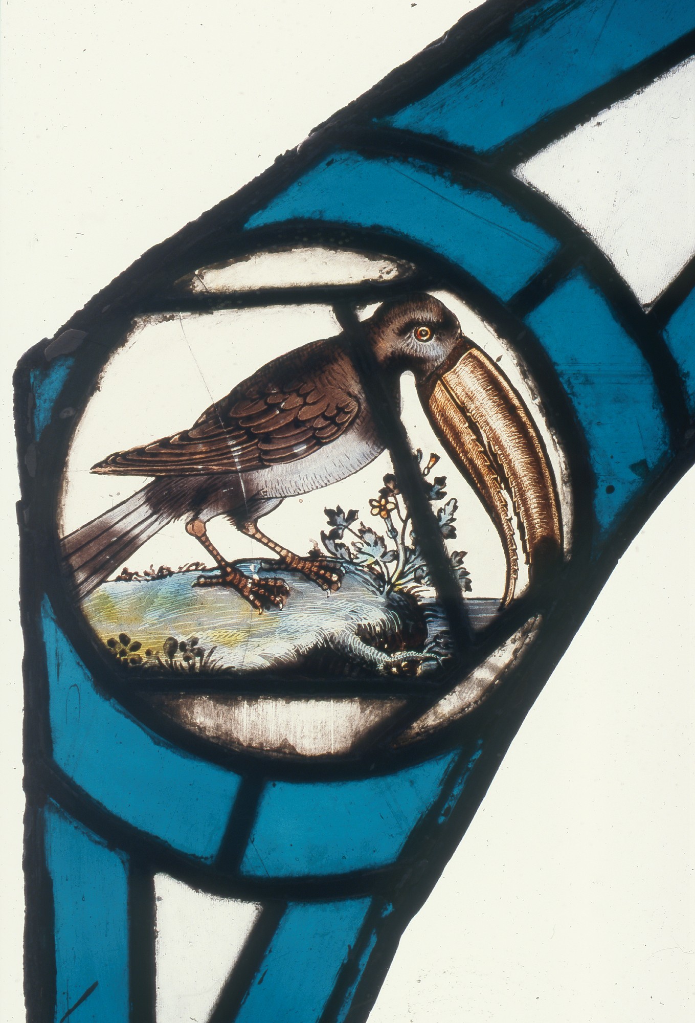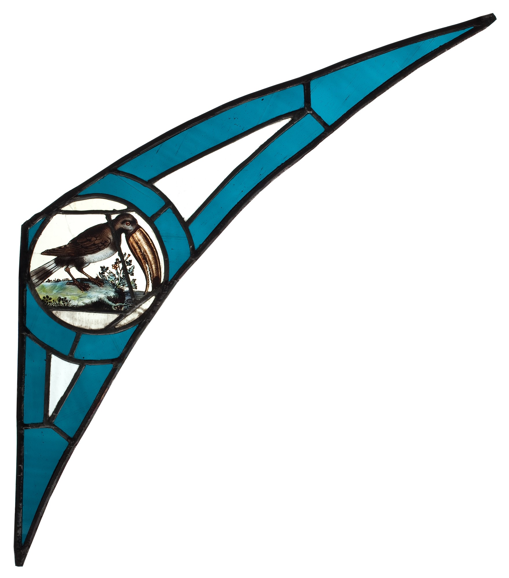 Trójkątne wypełnienie przyłucza lewego z wydłużonymi końcami i z lekko półkoliście wygiętą podstawą. Bordiury ze szkła niebieskiego, wypełnienia ze szkła katedralnego zielonkawego. W centralnej części tondo z przedstawieniem tukana, malowane farbami szkliwnymi.