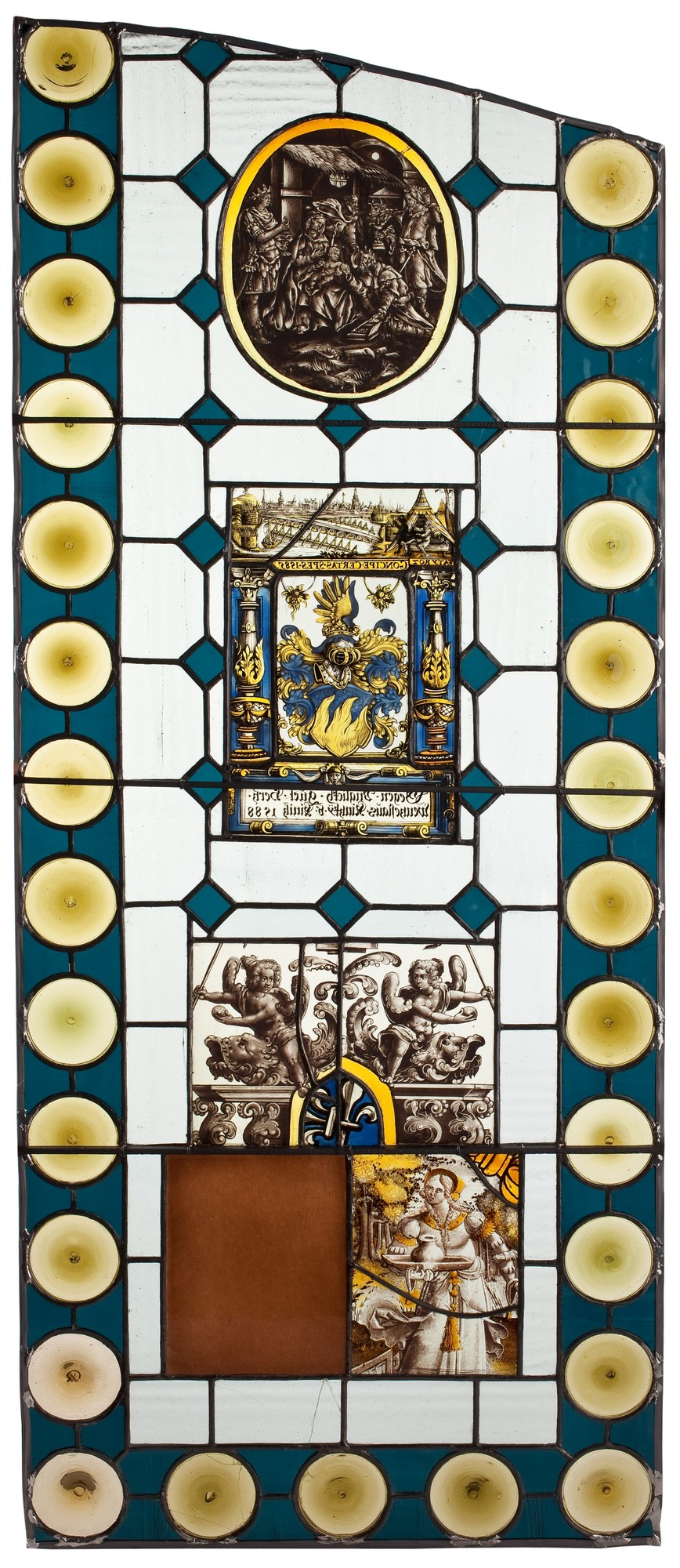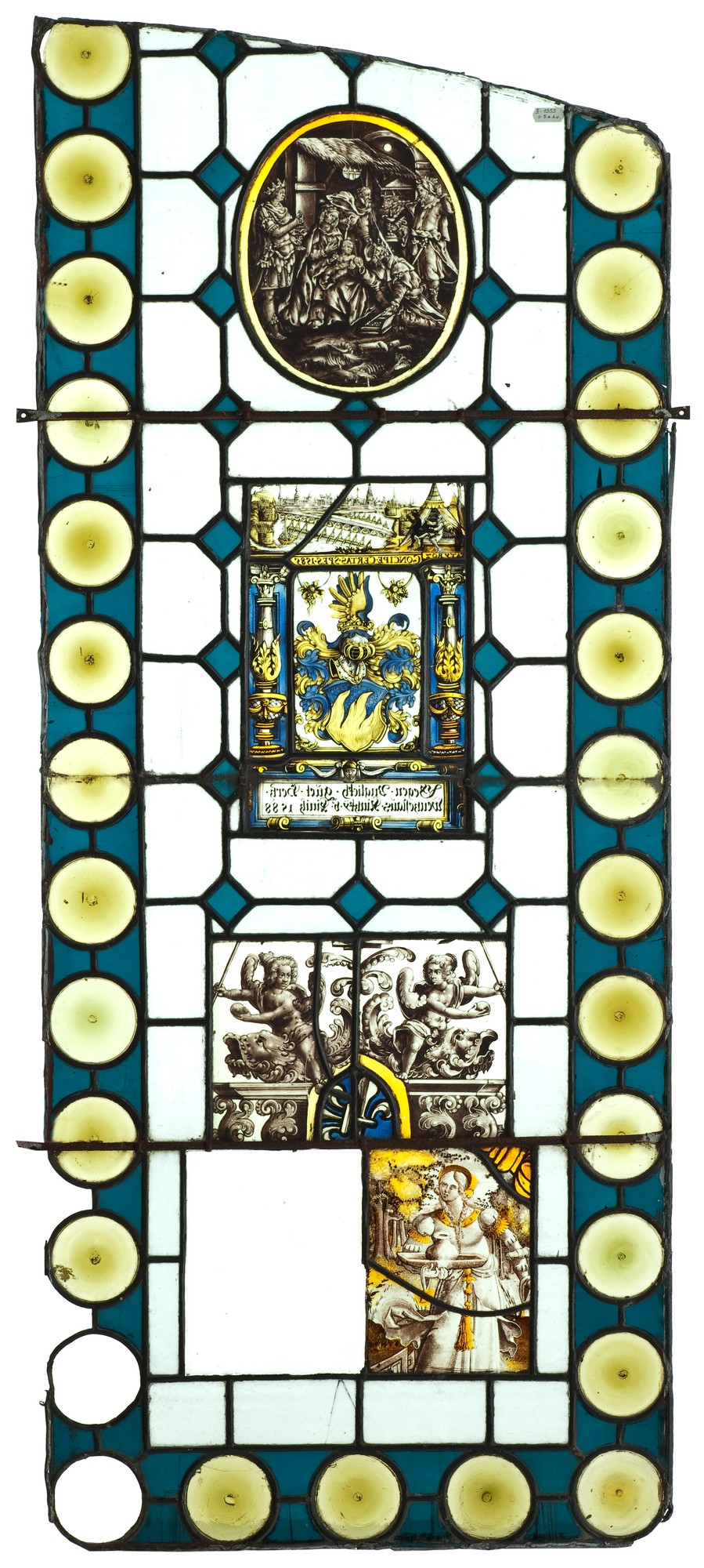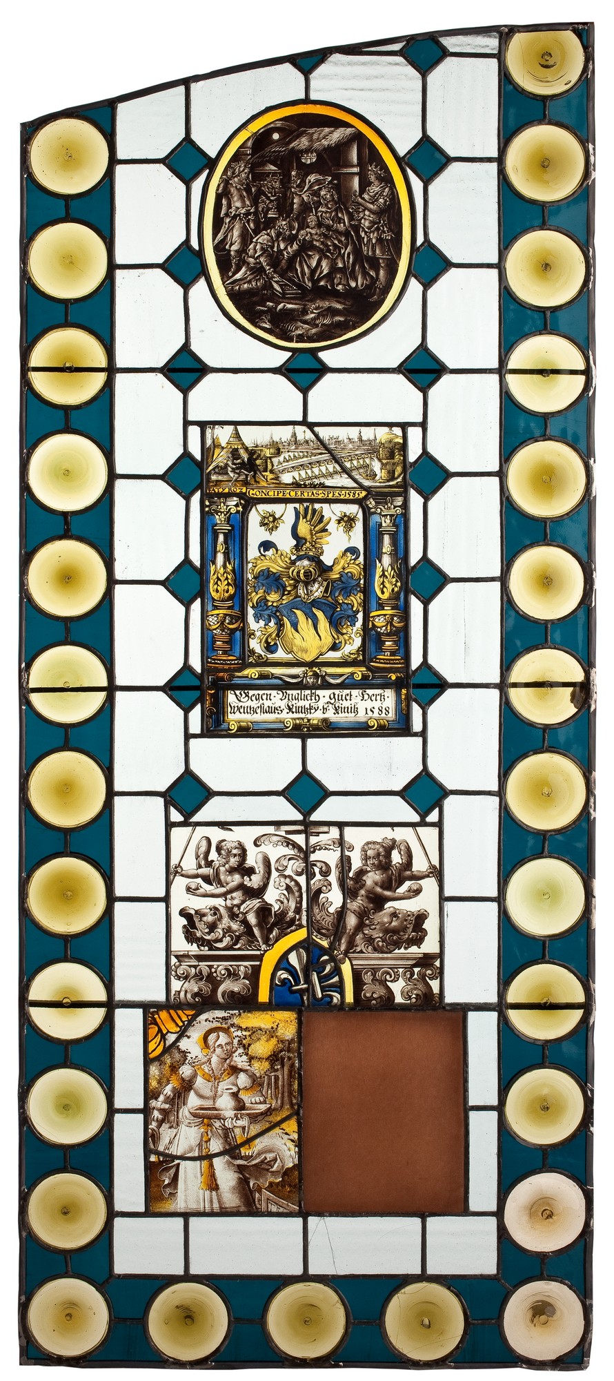 Części kompozycji bardzo zbliżone do dekoracji górnej części witrażu donacyjnego z 1629 roku przypuszczalnie z Kolonii. Przedstawiony jest tam herb flankowany przez dwa amorki na delfinach, malowany en grisaille i barwnymi farbami szkliwnymi. Poniżej herbu owalna szybka ze złotą bordiurą z przedstawieniem małego Jezusa pomiędzy św. Pawłem i św. Józefem. W tablicy niżej napis, mówiący o upamiętnieniu Henrica Venrada, który pochodził ze Zwolle (Niderlandy północne), przez Johannesa Nicolasa Venrada, kanonika kolegiaty św. Seweryna w Kolonii (?): Johannes Nicolai Venradi, Collegiatarum Ecclesiarum s. Severini et veteris s. Pauli apud monasterienses Westphalos canonicus amico henrico Venradio, condido swolgen E.E 1629. Witraż w zbiorach Museum Victoria & Albert w Londynie.