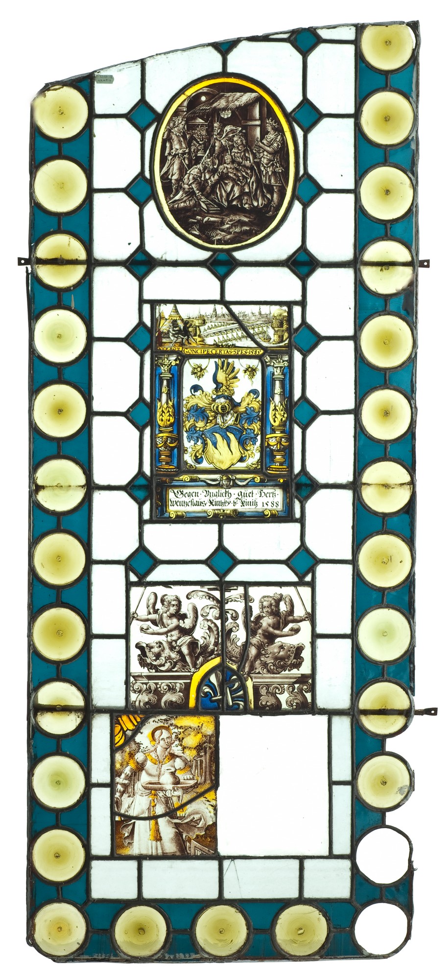 Scena nad herbem jest wzorowana na dekoracji medalu Aleksandra Farnese (zm. 1592), księcia Parmy i namiestnika cesarskiego w Niderlandach, wybitego w 1585 z okazji zdobycia Antwerpii. Napisy na witrażu odnoszą się zapewne do Wentzeslausa Kintzky von Kynitz (Wchinic) (1572-1626), podniesionego do godności panów cesarstwa w 1611 roku.